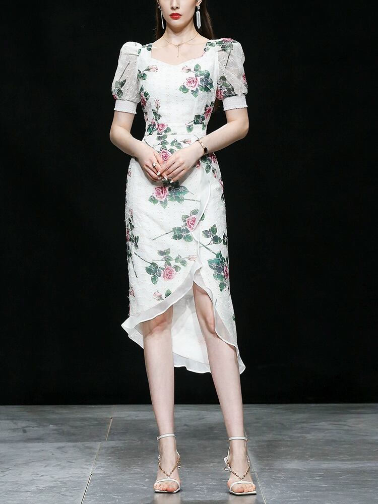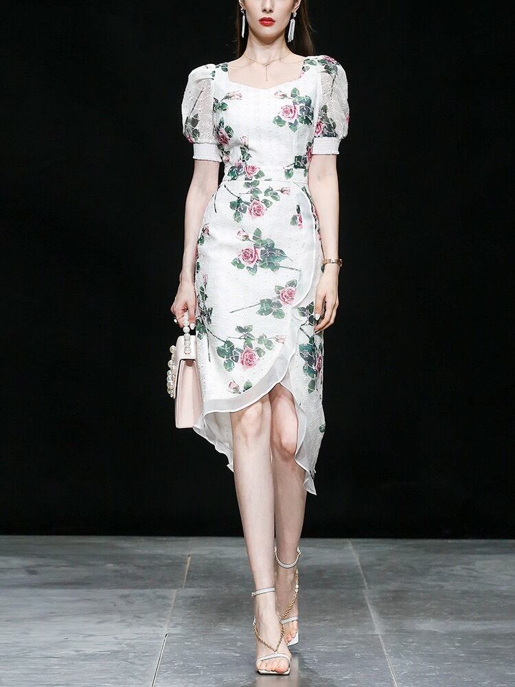Pinkoz 女性デザイナーローズフラワースクエアカラー夏ミディ不規則なドレス embroideried ペンシルドレスローブデ mujer vestidos ピンク 刺繍 サマー 夏物 フラワーデザイン スクウェア