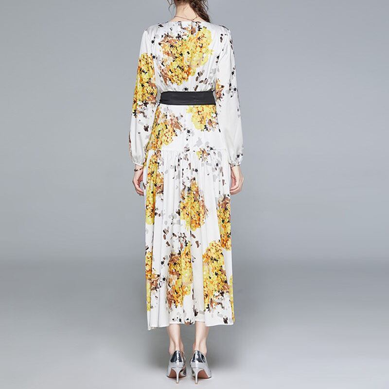 Pinkoz エレガントな v ネック黄色プリント ベルト弓ドレス レディ カジュアル長袖プラス サイズ ローブ ドレス新着春秋座 ロング ピンク リボン 大きめサイズ スプリング 春物 オータム 秋物 ハーネス Vネック