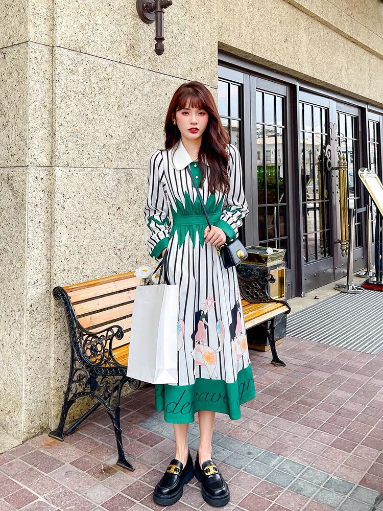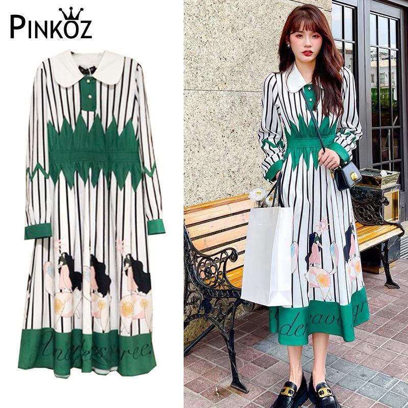 Pinkoz 滑走路デザイナー スタイリッシュなグリーン ストライプ ターン ダウン ボタン ハイ ワシット A ライン春秋ドレス ホリデー シックなローブ ド トラフ ピンク スプリング 春物 オータム 秋物 Aライン