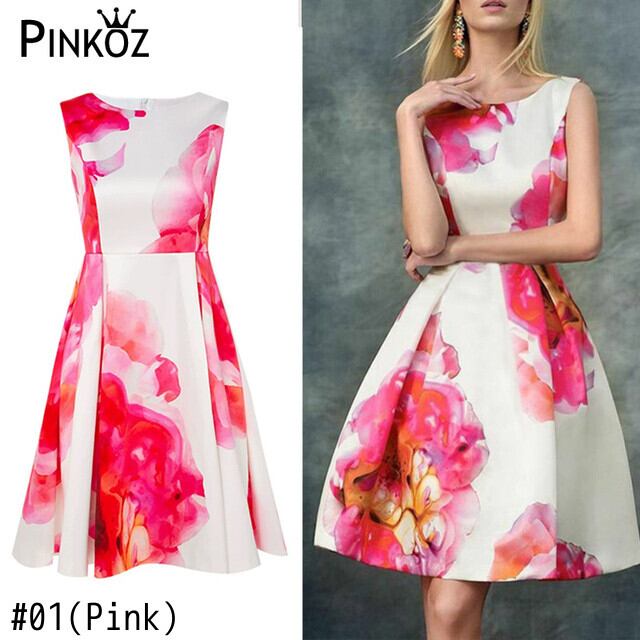 Pinkoz エレガントなヴィンテージ膝丈ドレス ピンク花柄夏ノースリーブ A ライン パーティー ドレス ファム ベスト ファッション traf サマー 夏物 Aライン フェミニン ビンテージ