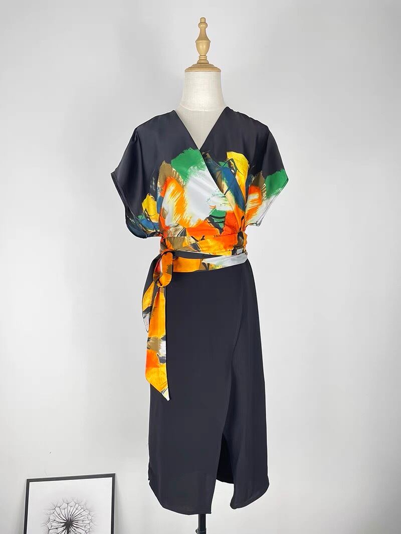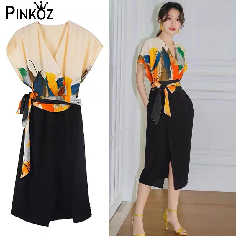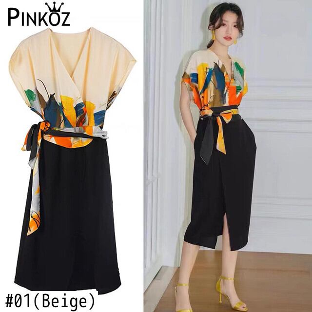 Pinkoz エレガントなフローラル プリント v ネック ハイ ウエスト サマー ドレス ペンシル オフィス レースアップ弓ロング ドレス シックなサテン ファッション vestidos ハイウェスト ピンク リボン 夏物 花柄 Vネック 会社 学校 通勤や通学にも