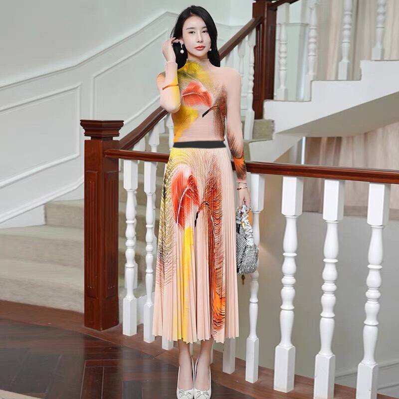 Pinkoz 女性プリーツ韓国ファッションオレンジ 2 点セット春秋スタンドトップス Tシャツ花柄プリントミディスカート衣装ヴィンテージ ピンク スプリング 春物 オータム 秋物 ビンテージ