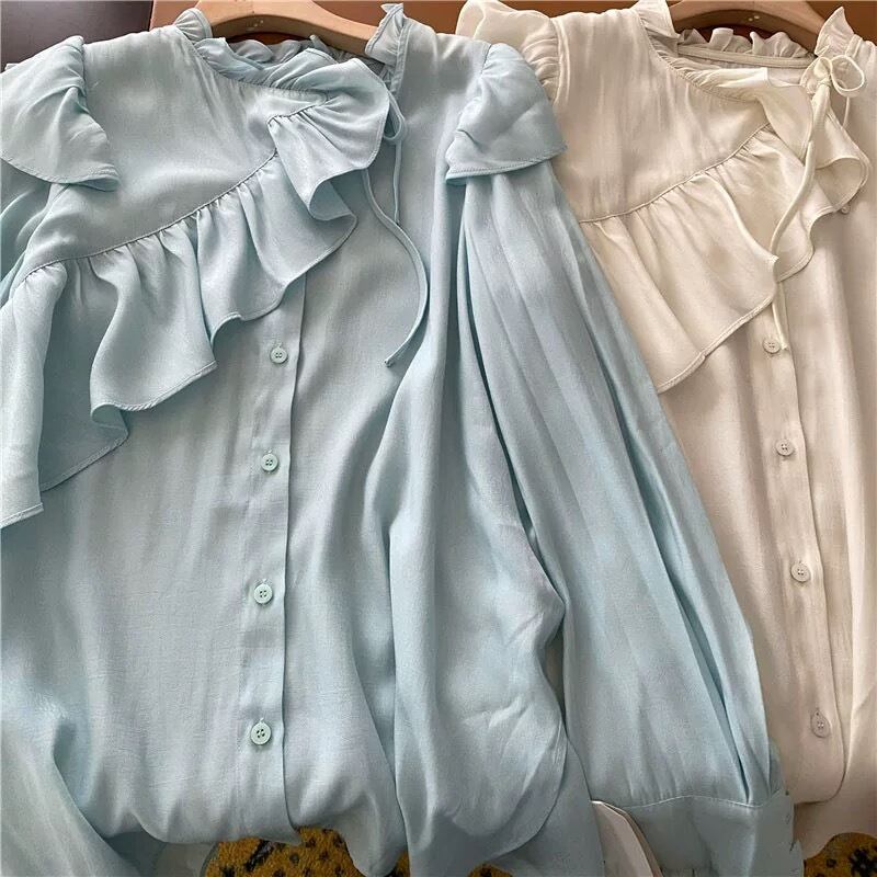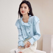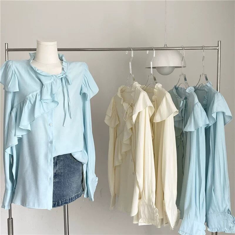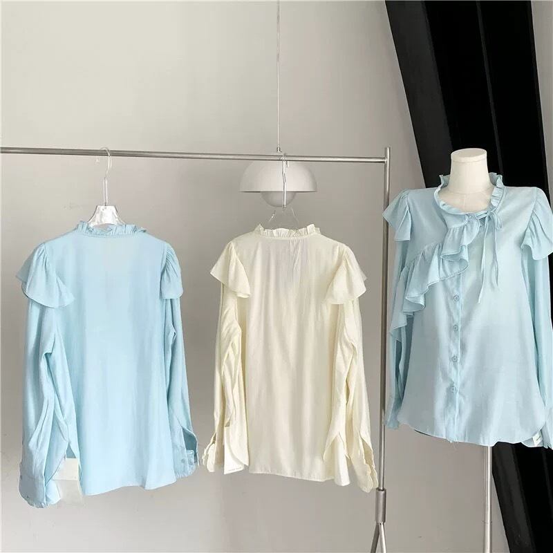Pinkoz 女性シフォン ブラウス トップ蝶ネクタイ フリル ライト ブルー ランタン スリーブ OL オフィス シャツ ピンク ランタンスリーブ リボン ラッフル 会社 学校 通勤や通学にも