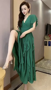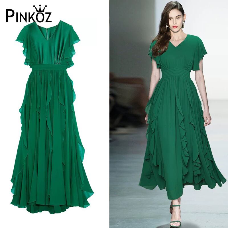 Pinkoz 滑走路デザイナー グリーン フリル ミディ ドレス ハイ ウエスト夏パーティー ナイト ロング ドレス大サイズ 3XL vestidos デ フィエスタ ハイウェスト ピンク ラッフル 大きめサイズ サマー 夏物