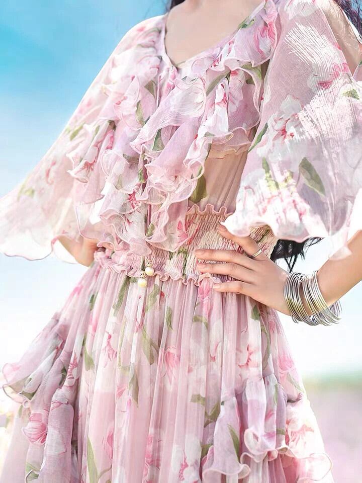 Pinkoz スウィートブラッシュピンク Floal プリント女性ドレス誕生日パーティーかわいいフリルティアードチュールミニスクールパーティードレス女性 レッド ラッフル 大人ガーリー キュート カジュアル