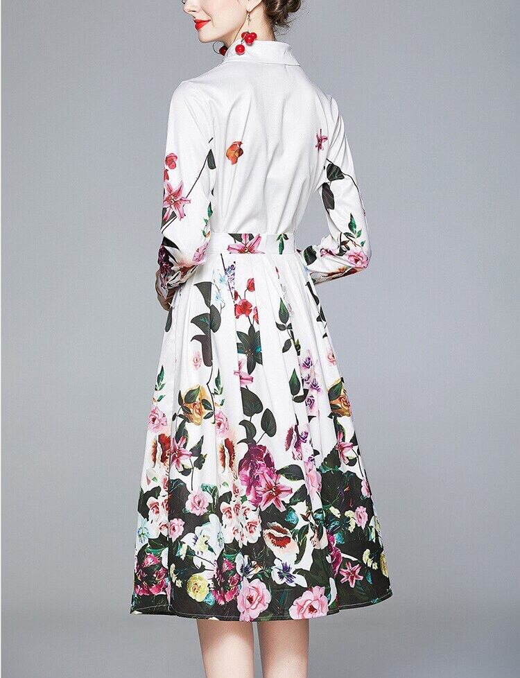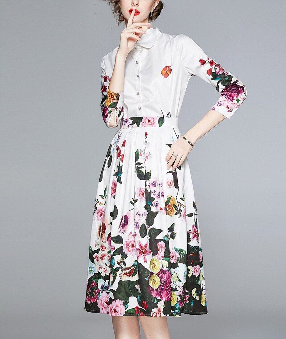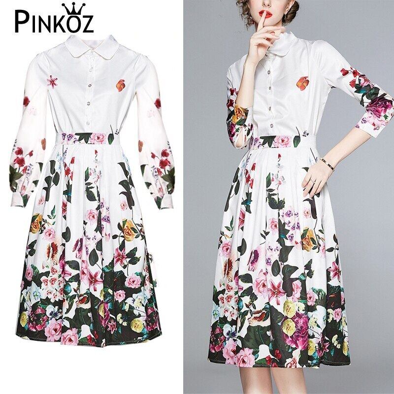 Pinkoz 2 ピース セット女性春秋シングル ブレスト長袖シャツ ブラウス プリント トップスとスカート熱帯の花セット ロング ピンク スプリング 春物 オータム 秋物 フラワーデザイン