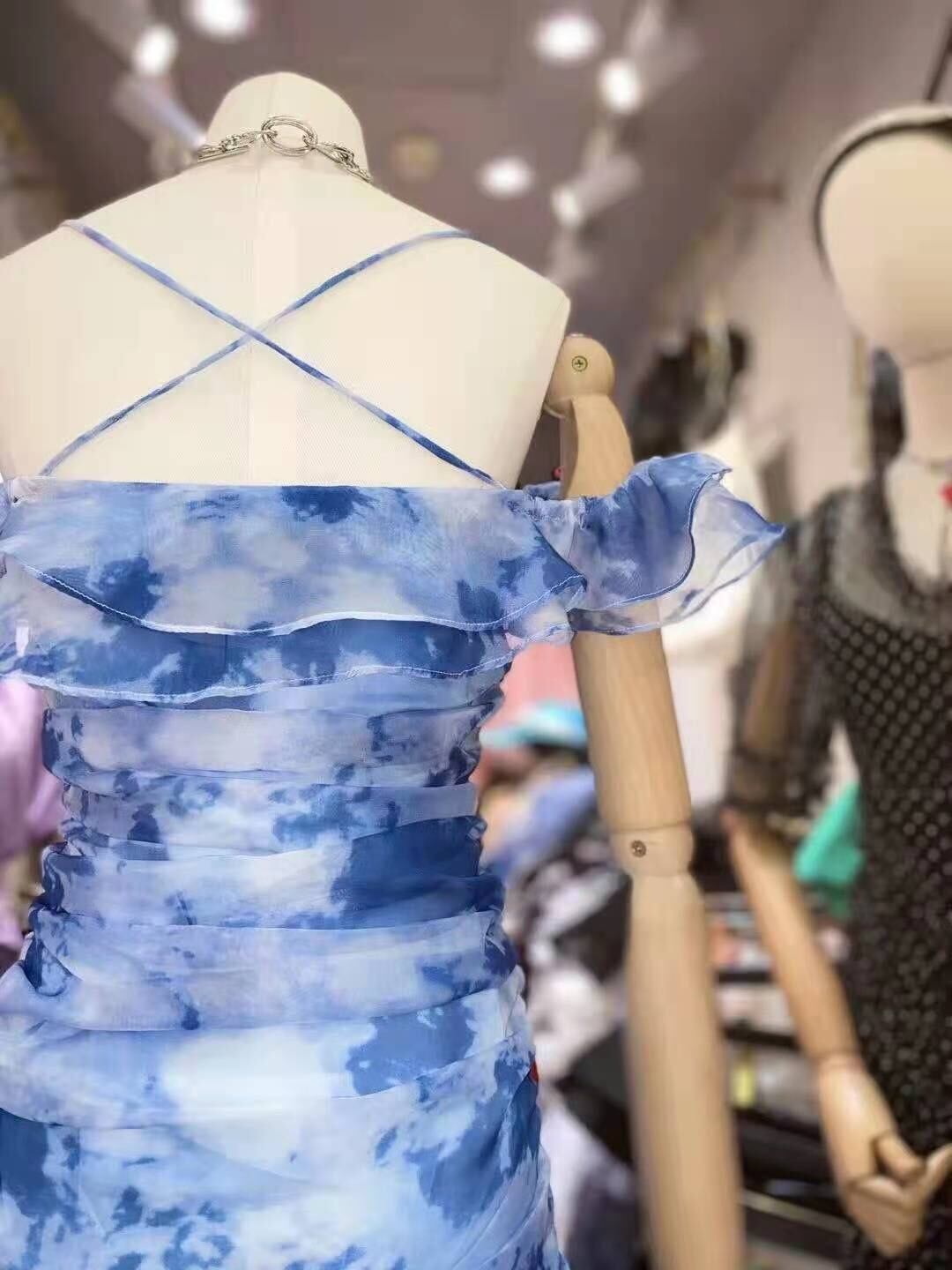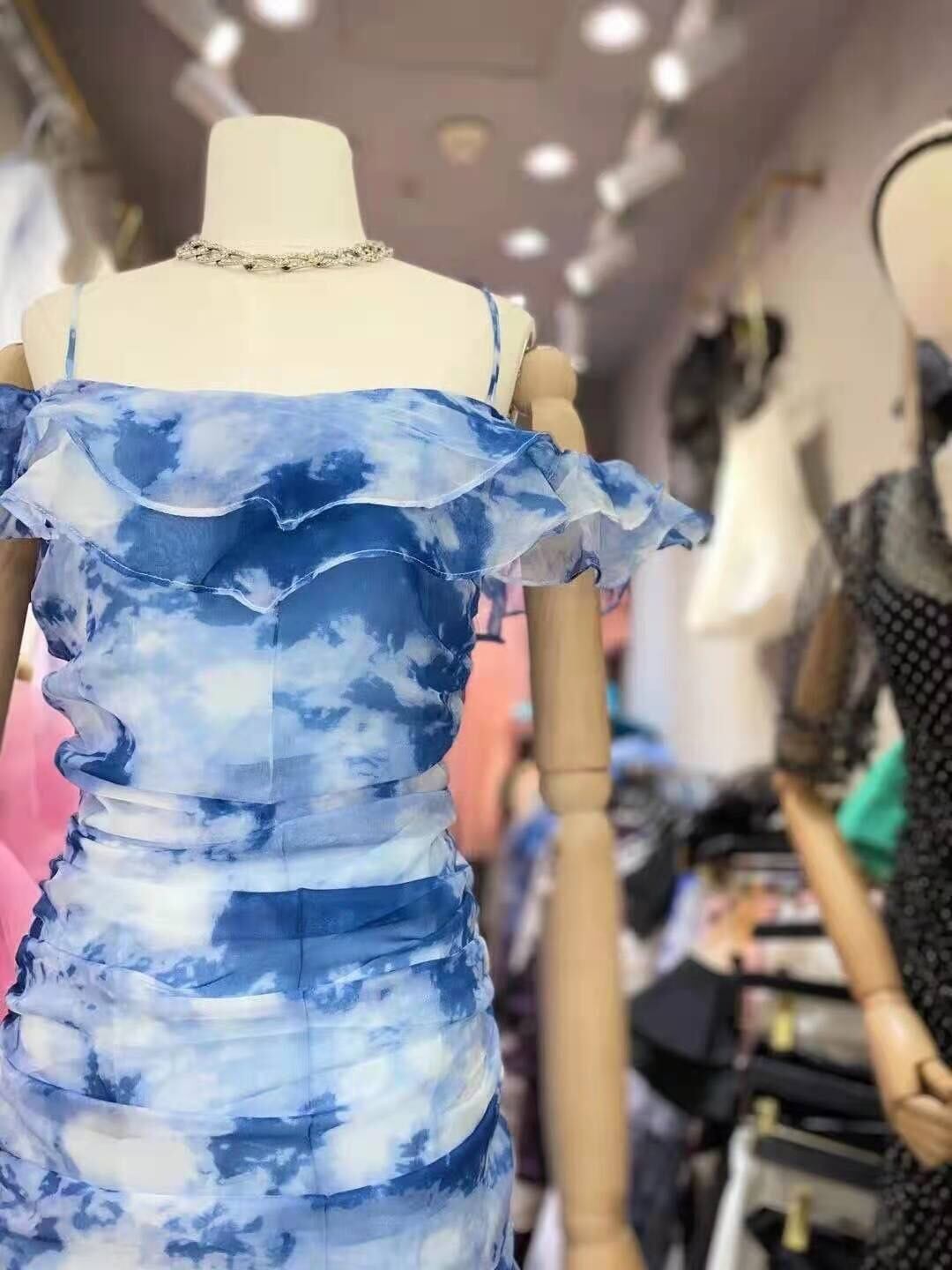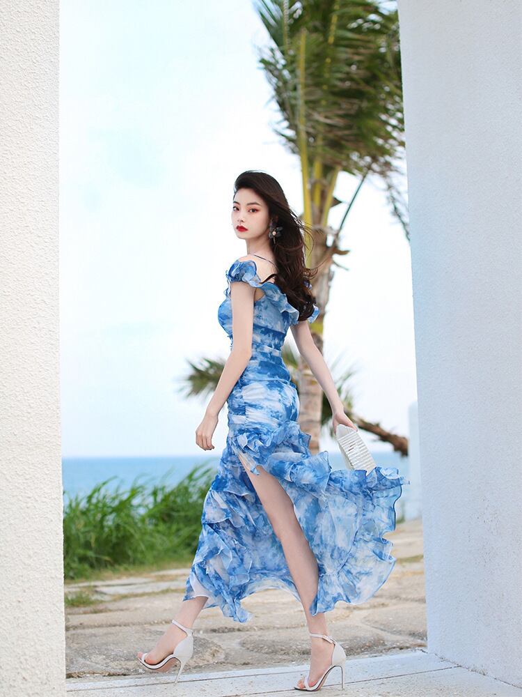 Pinkoz デザイナーフリルスラッシュネックぬるぬるマキシドレス青水墨画背中の開いたセクシーなパーティーローブ女性祭布 ピンク ブルー ラッフル