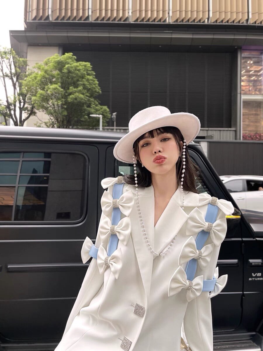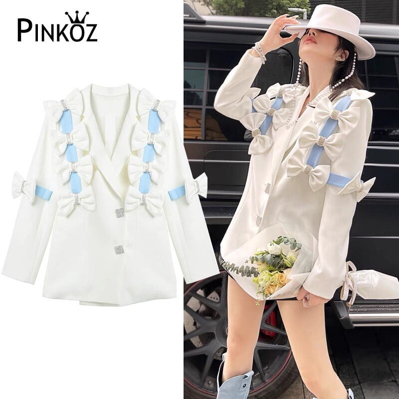 Pinkoz 滑走路デザイナーセレブスタイル白ブレザー女性かわいい甘い弓高級パーティージャケットオフィスレディトップスブレザー女性新 ピンク ホワイト リボン 大人ガーリー スウィート キュート カジュアル 会社 学校 通勤や通学にも