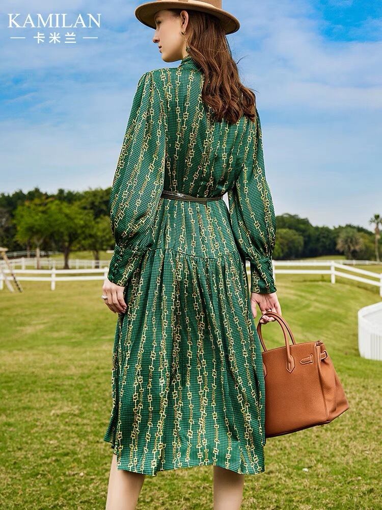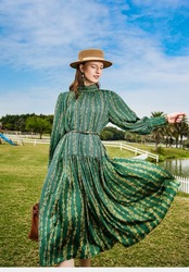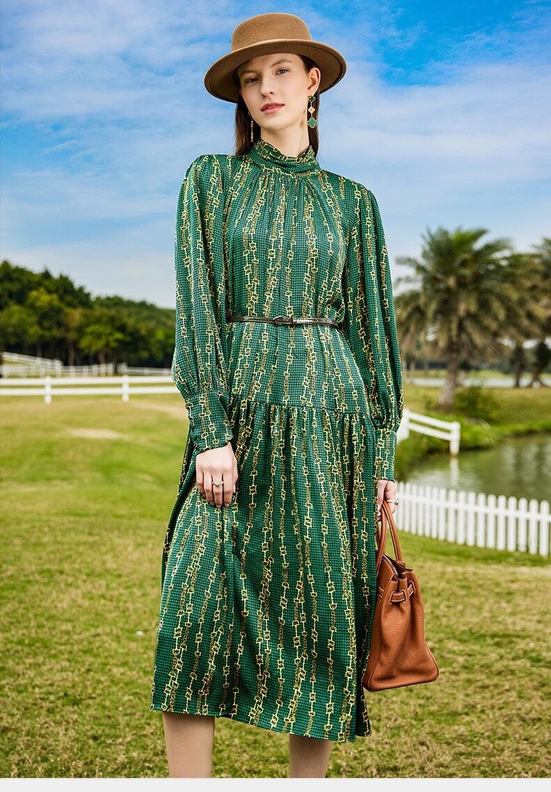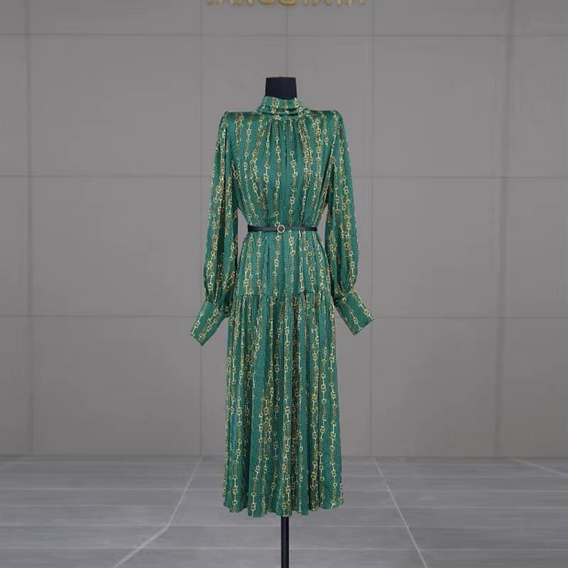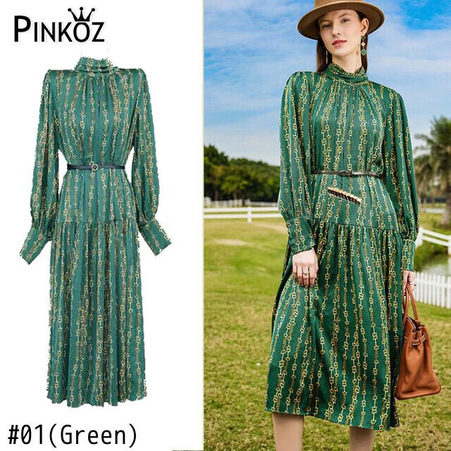 Pinkoz 女性ルーズスタンドカラーフルスリーブグリーンミディドレスステインチェーンパターンカジュアルエレガントなドレスビッグサイズ vestidos M-4XL ピンク