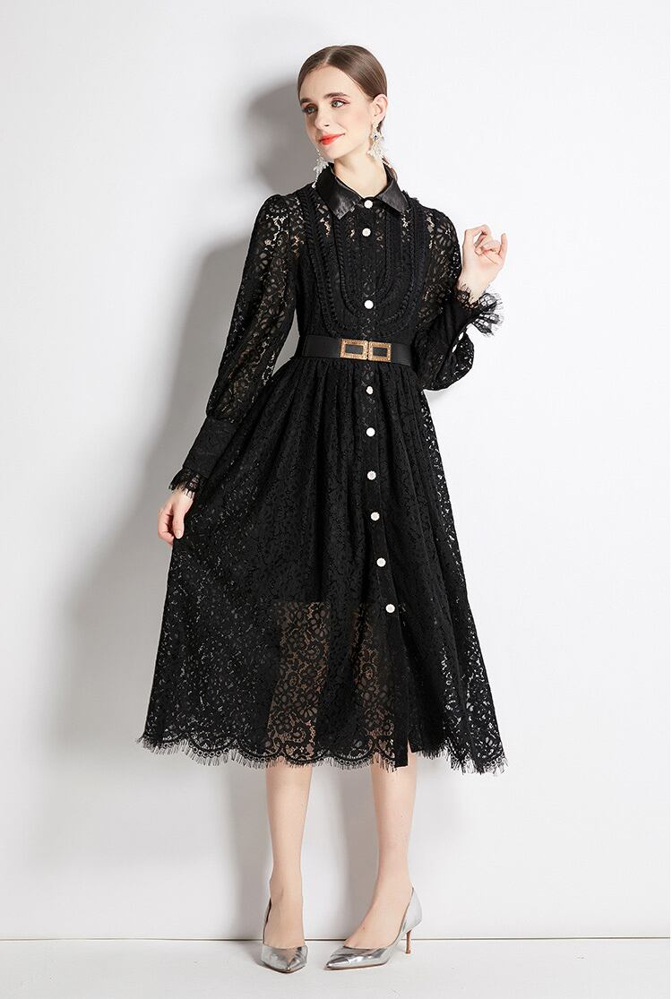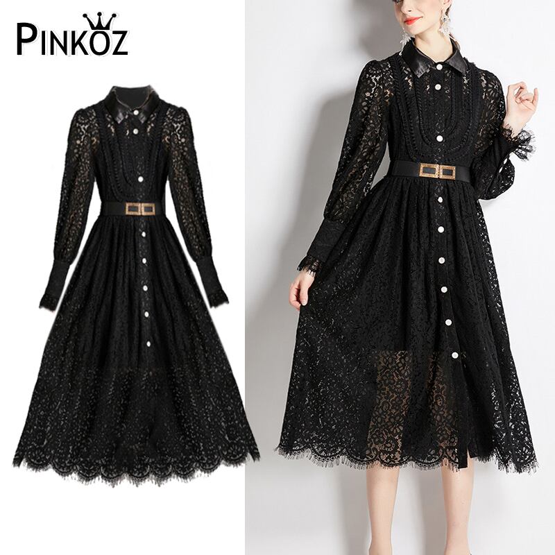Pinkoz 滑走路デザイナー ゴシック黒ミディ ドレス レース中空アウト スタンド カラー シングル ブレスト A ライン vestidos ローブ デ mujer ピンク ブラック Aライン