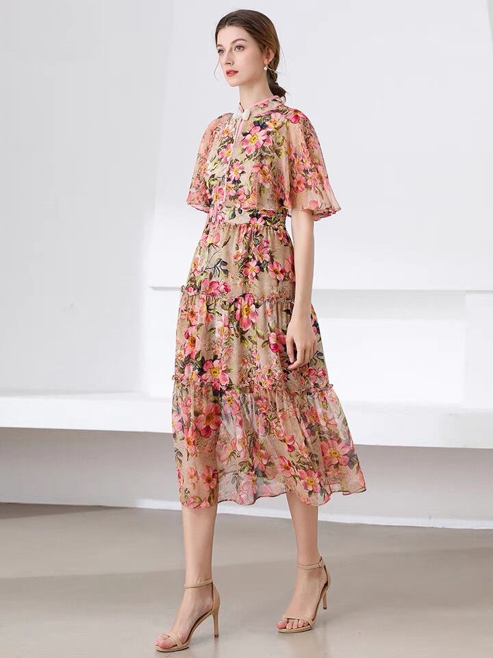 Pinkoz ヴィンテージ花柄ミディ ドレス スタンド襟バタフライ スリーブ休日自由奔放に生きる花プリント A ライン パーティー ナイト ドレス vestidos z ピンク Aライン フラワーデザイン ビンテージ