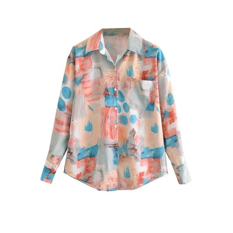 Pinkoz ヴィンテージ塗装ターン ダウン襟フル スリーブ ルーズ ブラウス女性大サイズ ハイ ストリート オー ファム シュミーズ トップ mujer traf ピンク 大きめサイズ フェミニン ビンテージ