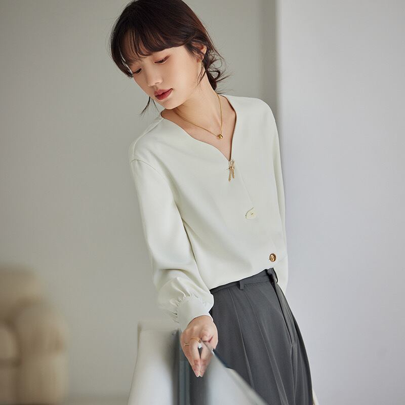 Pinkoz エレガント ホワイト ホワイト シングル ブレスト ブラウス v ネック オフィス レディ フル スリーブ ファッション シックなボタン シャツ トップス ピンク Vネック 会社 学校 通勤や通学にも