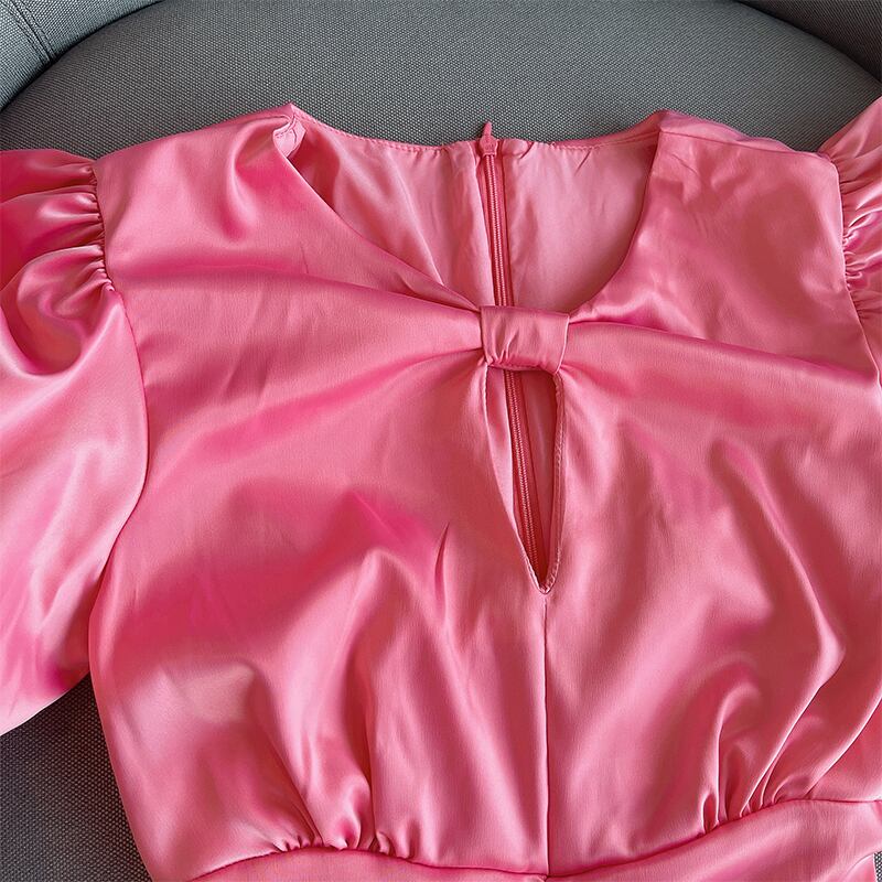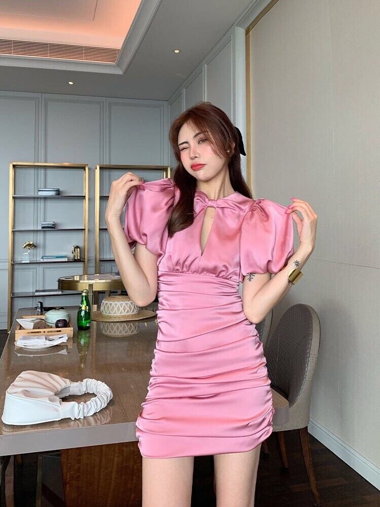 Pinkoz 女性デザイナースタイリッシュなピンク ssatin ミニドレスパーティーディナー中空アウトシャーリングぬるぬるボディコンナイトパフスリーブドレス サテン