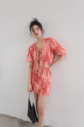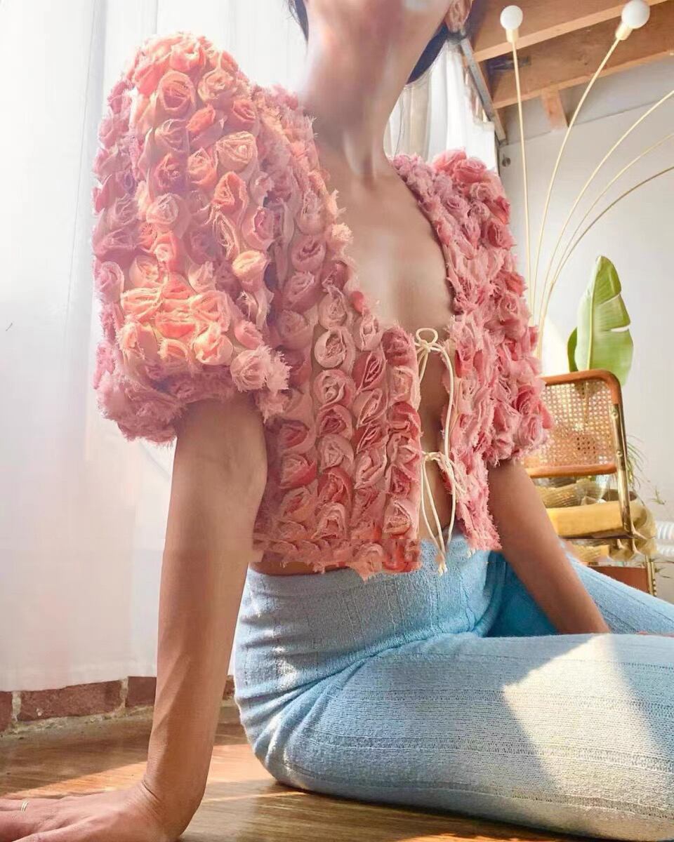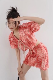 Pinkoz デザイナー 2 ピース 3D ローズ フラワー ショート クロップド トップス サマー ピンク トップス + ミニ ぬるぬる スカート シックな INS y2k 衣装 レースアップ スーツ 夏物 フラワーデザイン