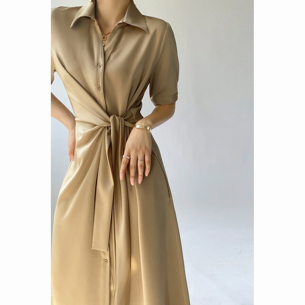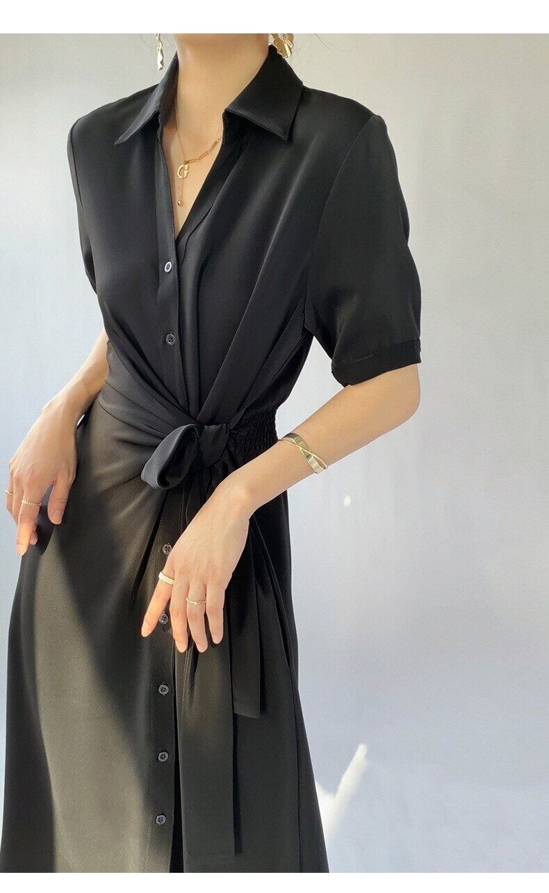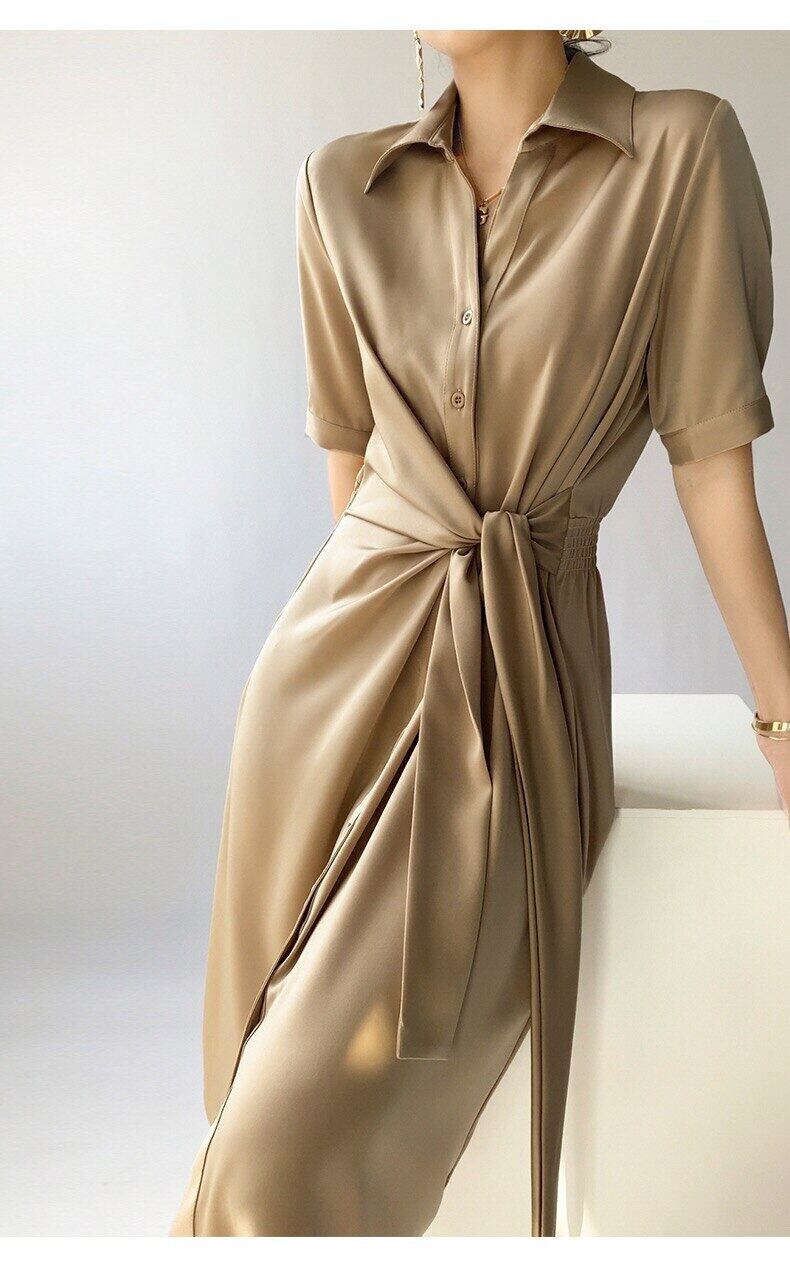 Pinkoz 女性の基本的なミディシャツドレスデザイナースタイリッシュなレースアップターンダウン襟オフィスレディエレガントなサテンレースアップサッシミディローブ ピンク 会社 学校 通勤や通学にも