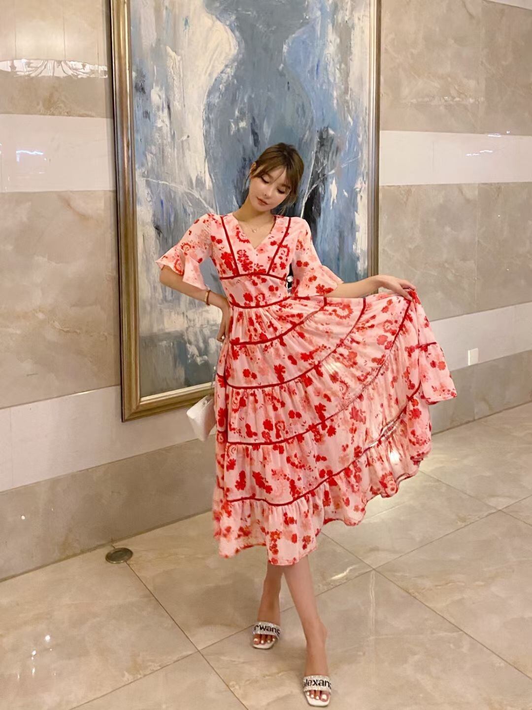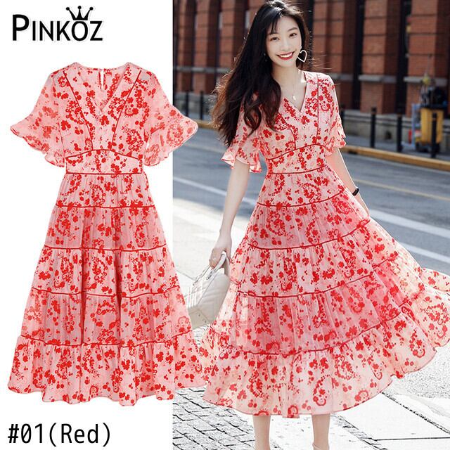 Pinkoz 女性赤花柄プリント v ネック フレア スリーブ ミディ ドレス カジュアル ホリデー ビーチ シックなナイト ローブ デ mujer vestidos ヴィンテージ ピンク レッド フレアスリーブ Vネック ビンテージ