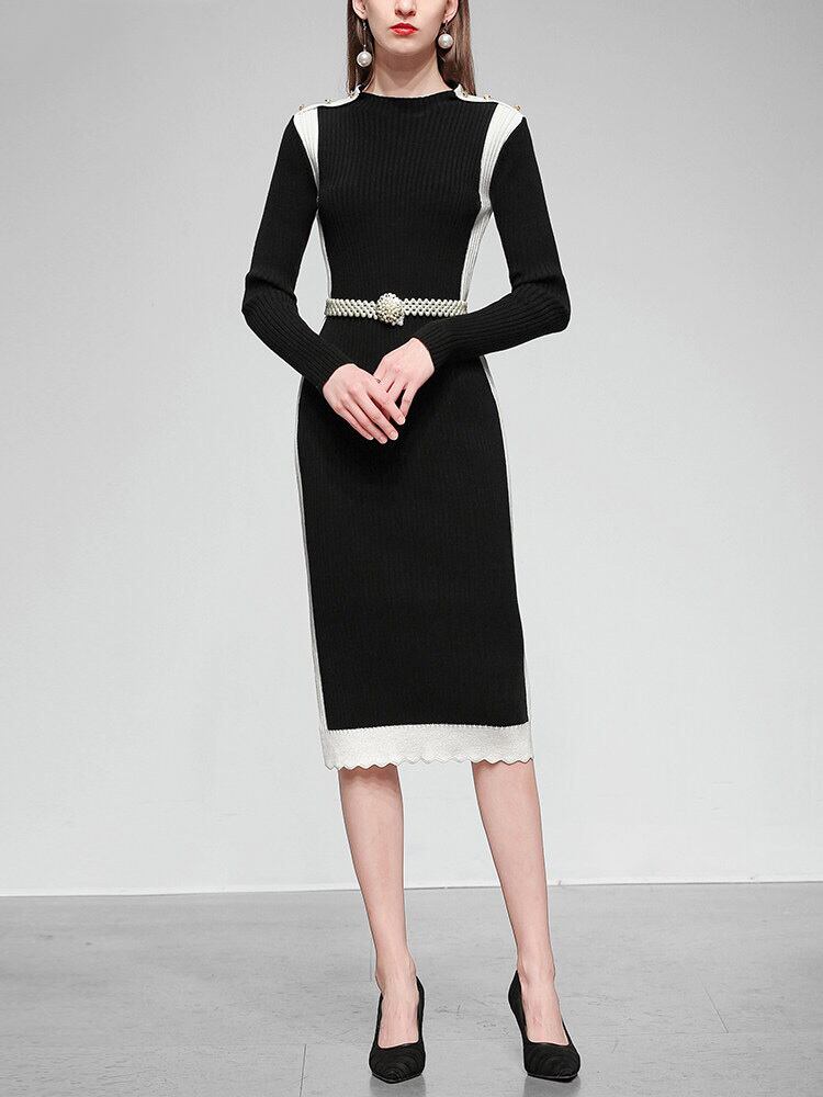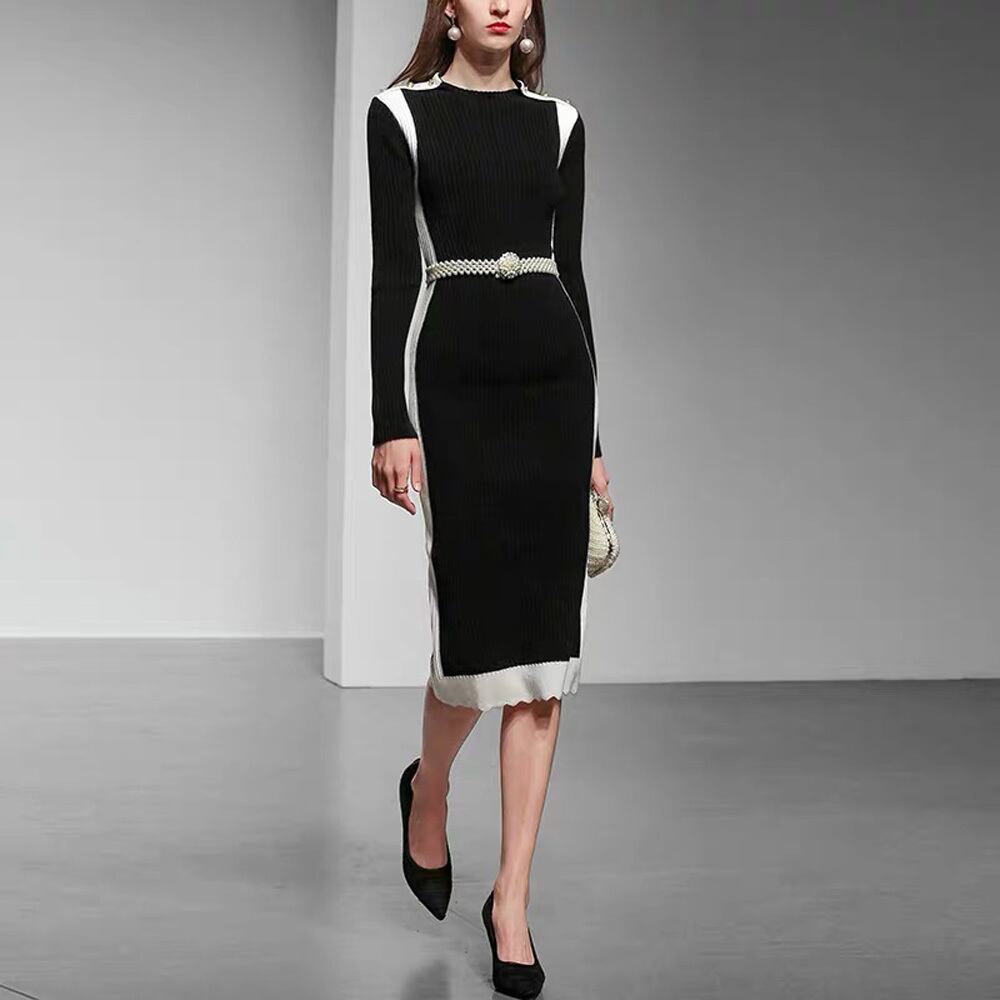 Pinkoz 女性滑走路デザイナー黒ぬるぬるミディ ドレス フリル パッチワーク ニット ボディコン秋冬 OL ドレス ベルト付き traf ピンク ブラック ラッフル オータム 秋物 ウィンター 冬物 ハーネス