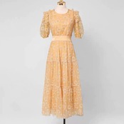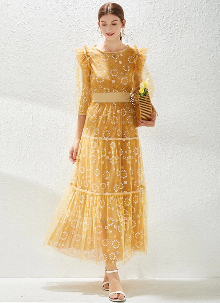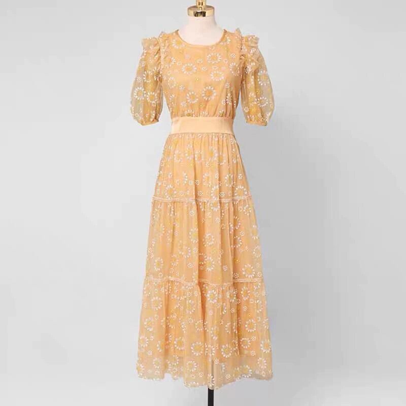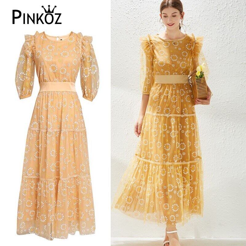Pinkoz デザイナー花刺繍マキシハーフスリーブ春秋のドレスパーティーナイト女性ファッション衣類シャーリングローブ mujer ピンク 半袖 スプリング 春物 オータム 秋物 フラワーデザイン