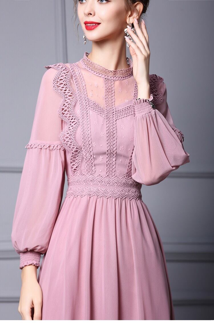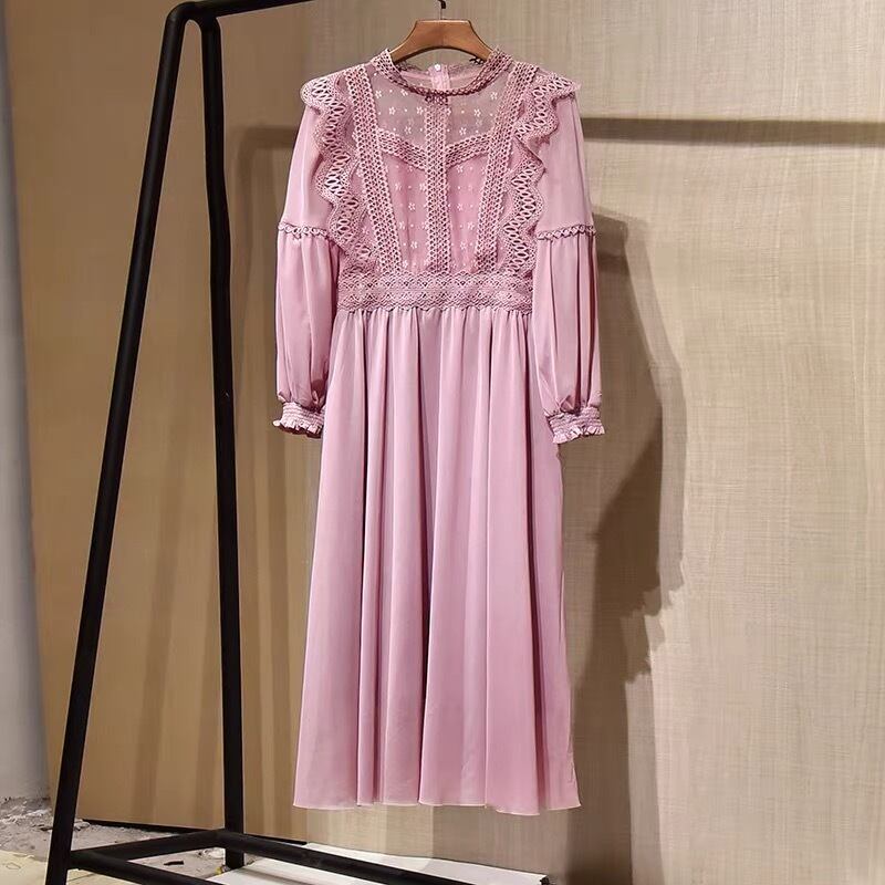Pinkoz vintagepink レースミディドレススウィート女性服ファッションフルスリーブ緩い春秋ドレスフェスティバル高級ローブ y2k ピンク 大人ガーリー キュート カジュアル スプリング 春物 オータム 秋物 ビンテージ