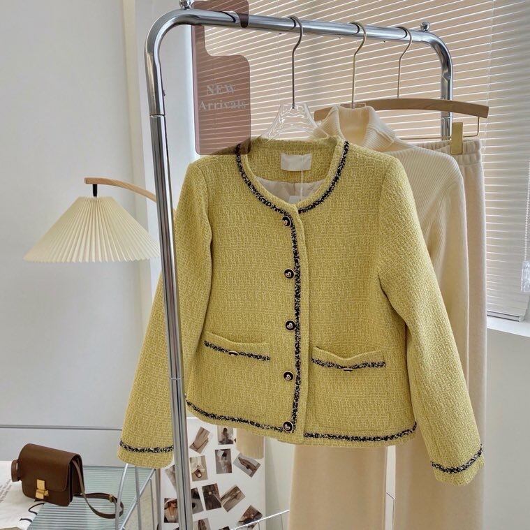 Pinkoz イエロー ボタン ツイード ショート スリム ジャケット 秋冬 ファッション エレガント OL トップス カサコス デ インベルノ フェミニーノ 座 ピンク オータム 秋物 ウィンター 冬物 会社 学校 通勤や通学にも