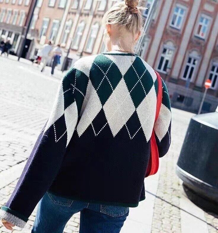 Pinkoz カジュアルルース女性ダークグリーンチェック柄セータートップス秋冬シックな韓国ファッションストリートカーディガンファッション za ピンク オータム 秋物 ウィンター 冬物