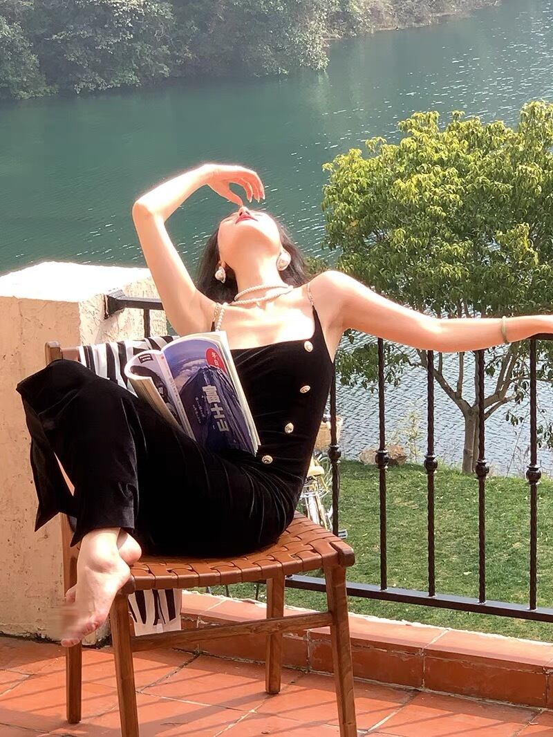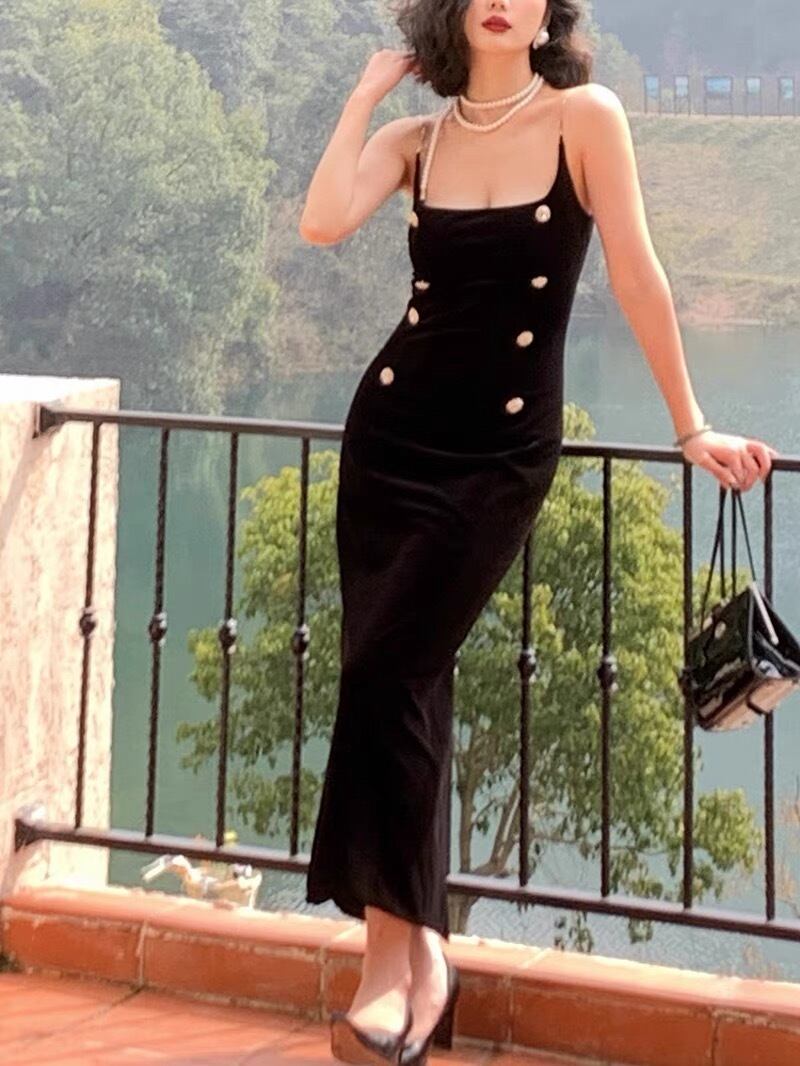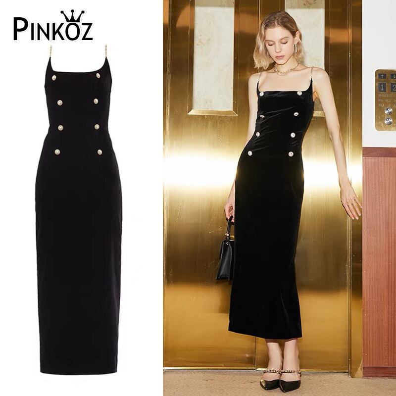 Pinkoz 滑走路デザイナー ベルベット マキシ ドレス ダブル ブレスト スパゲッティ ストラップ ボタン パーティー ナイト ぬるぬる クラブ ドレス robe de mujer za ピンク