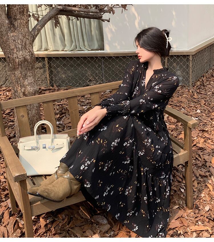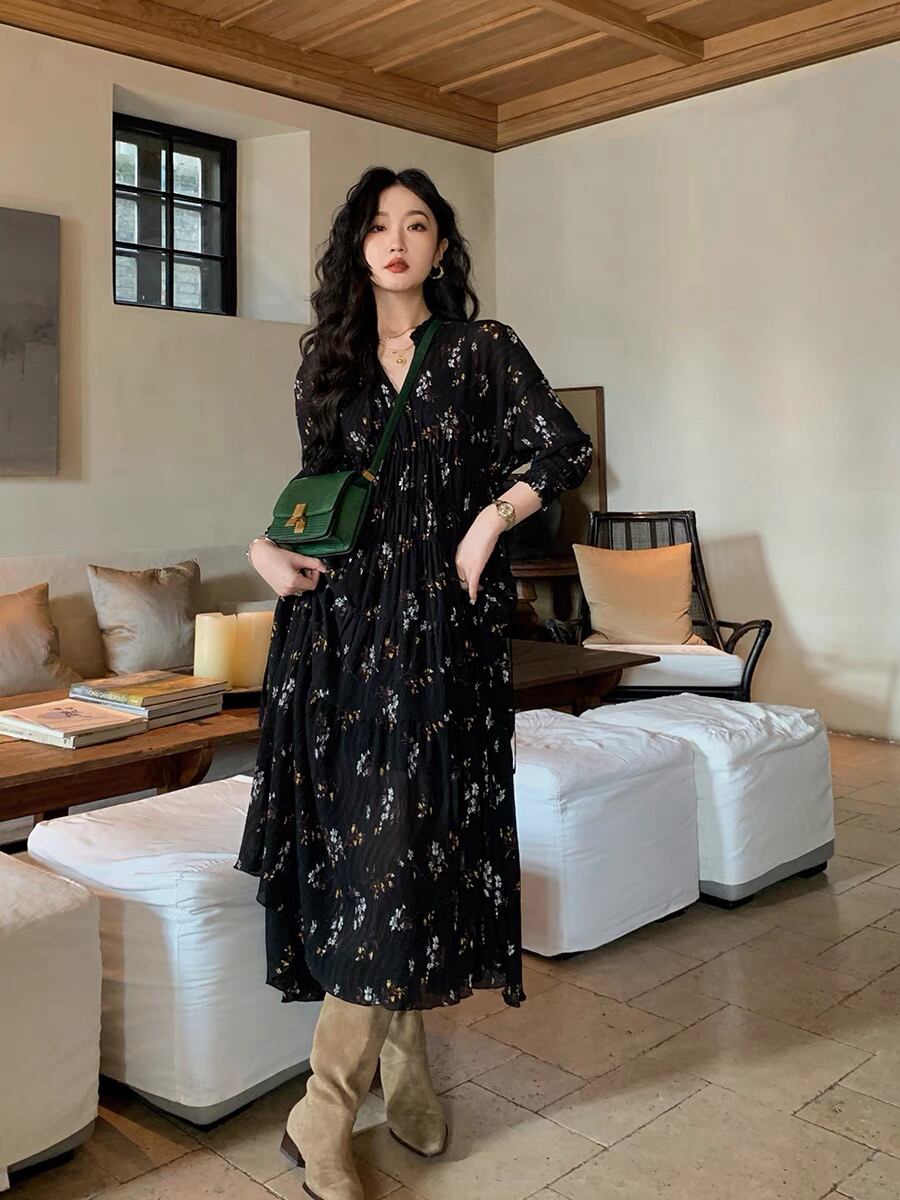 Pinkoz 女性黒花柄プリント v ネックシャーリング プリーツ ミディ ドレス ルーズ サイズ シフォン カジュアル ゴシック エレガント ローブ デ mujer ピンク ブラック Vネック