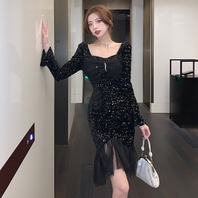 Pinkozparty 人魚ぬるぬる女性ドレス スパンコール sqaure 襟フレア スリーブ パッチワーク メッシュ フリル ミディ ドレス vestidos ヴィンテージ z ピンク フレアスリーブ ラッフル ビンテージ