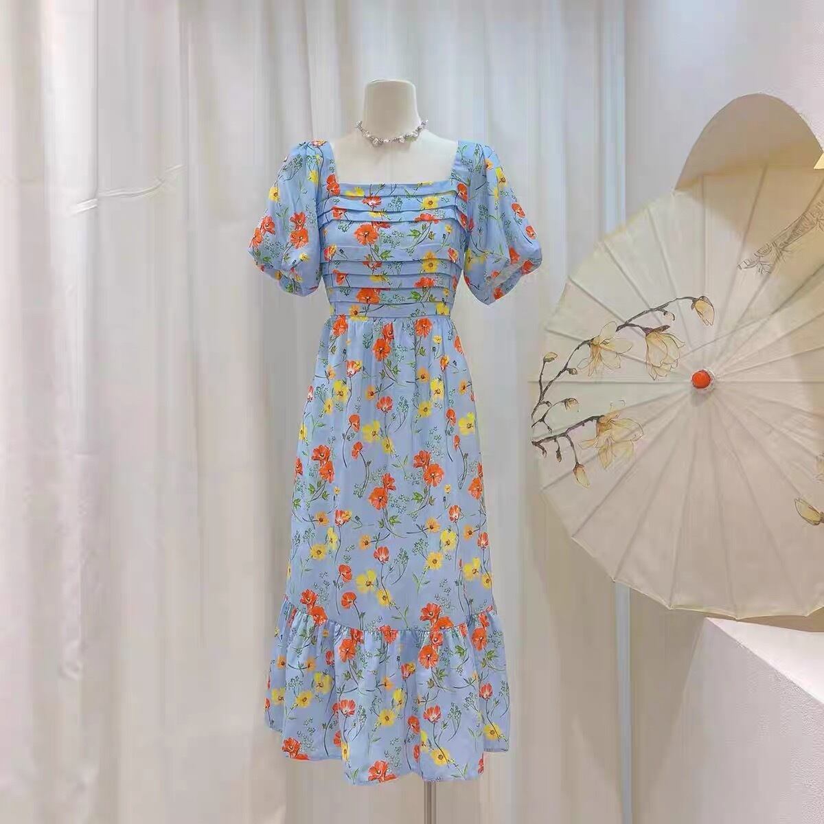 Pinkoz 滑走路夏ミディ ドレス女性のパフ スリーブ フラワー プリント パーティー プリーツ ドレス Vestdios Y2K ピンク サマー 夏物 フラワーデザイン
