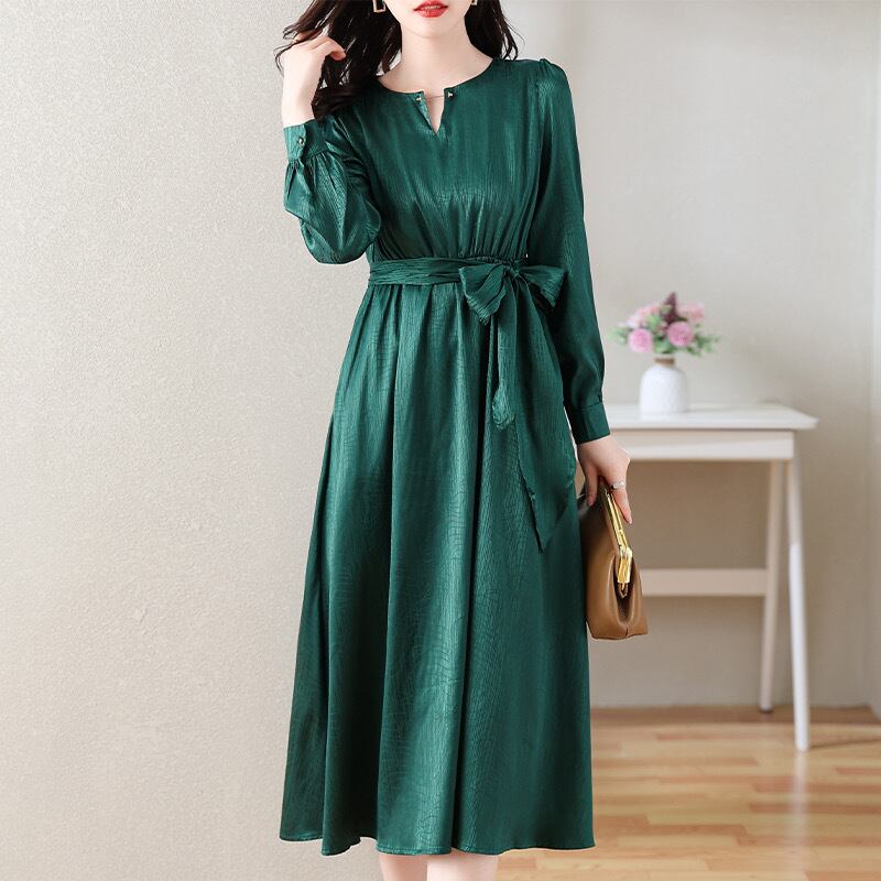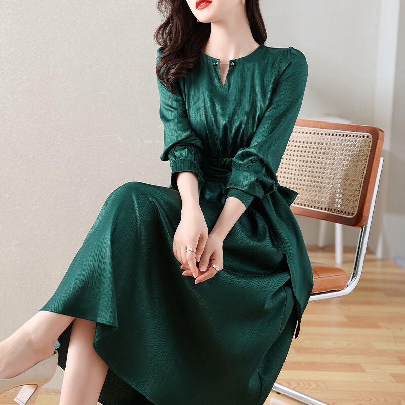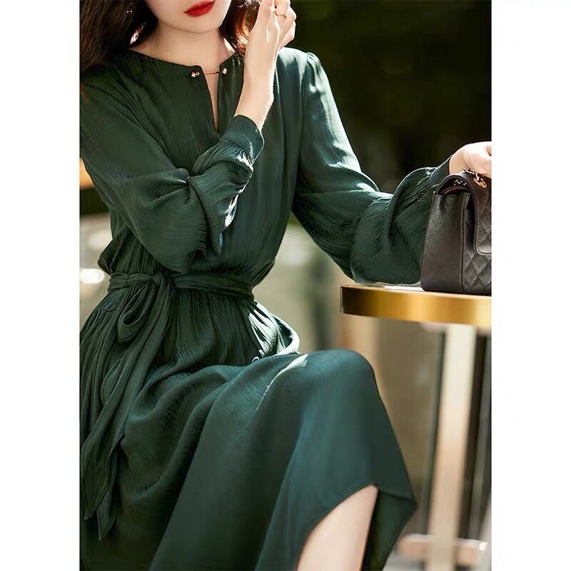 Pinkoz エレガントな女性ミディ ドレス ダーク グリーン v ネック長袖金属ボタン ドレス カジュアル ルーズ スタイリッシュ ローブ デ mujer vestidos ロング ピンク Vネック