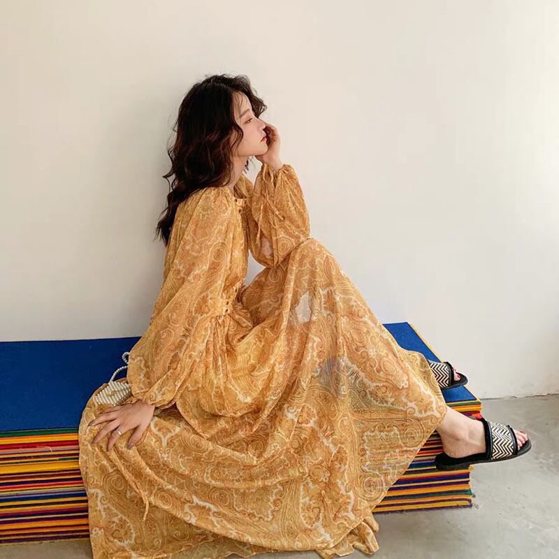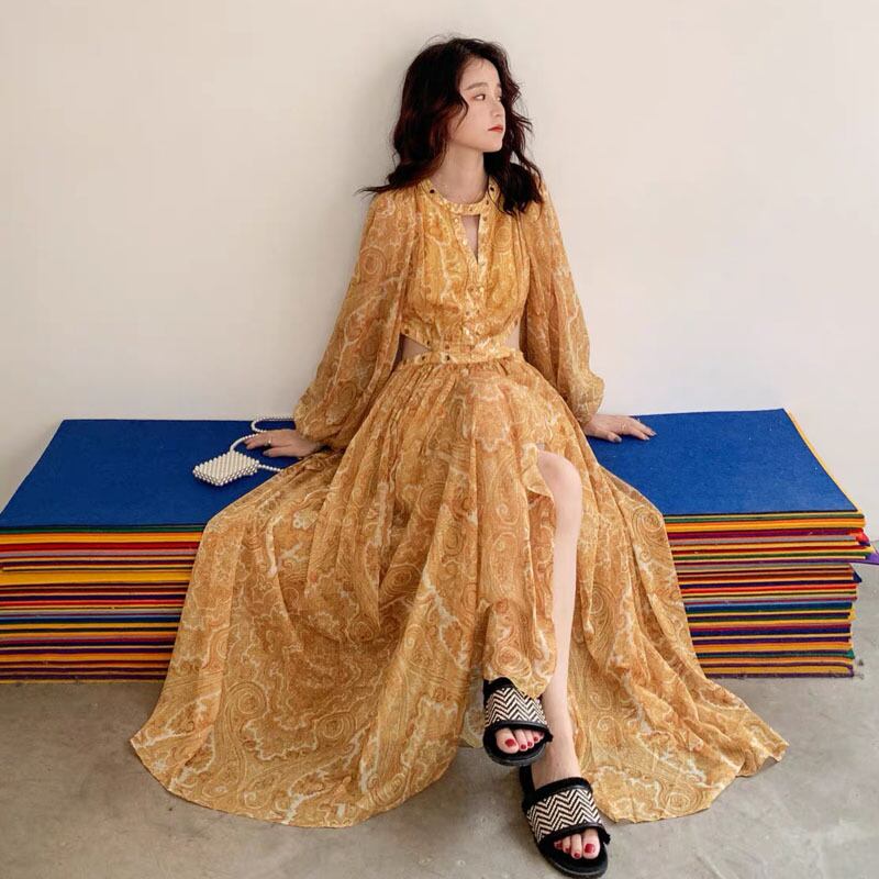 Pinkoz 自由奔放に生きる花柄プリント ホリデー ロング ドレス中空黄色シフォン パーティー マキシ ドレス春夏 Vestidos デ フィエスタ ピンク スプリング 春物 サマー 夏物