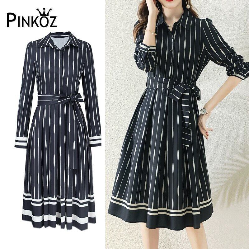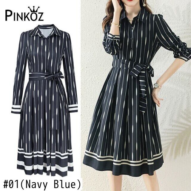 Pinkoz エレガントな女性の膝丈ネイビー ブルー プリーツ ドレス ターン ダウン襟作業オフィス レディ ファッション服ビッグ サイズ vestidos ピンク 会社 学校 通勤や通学にも
