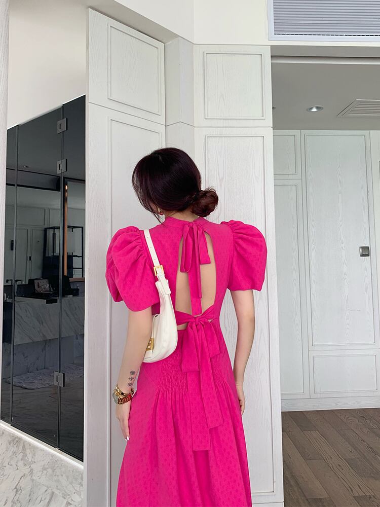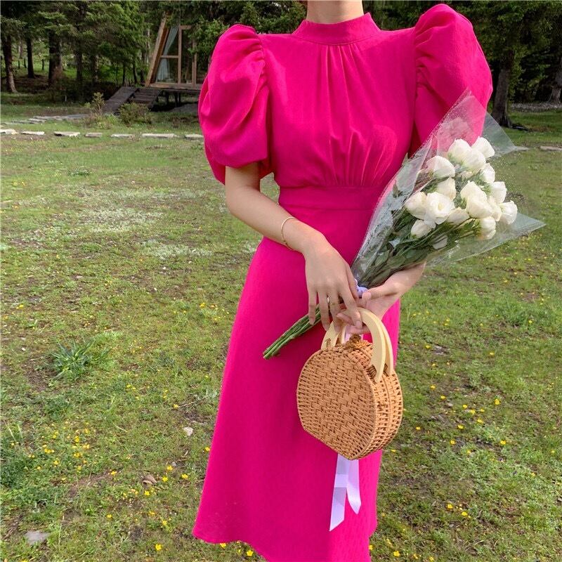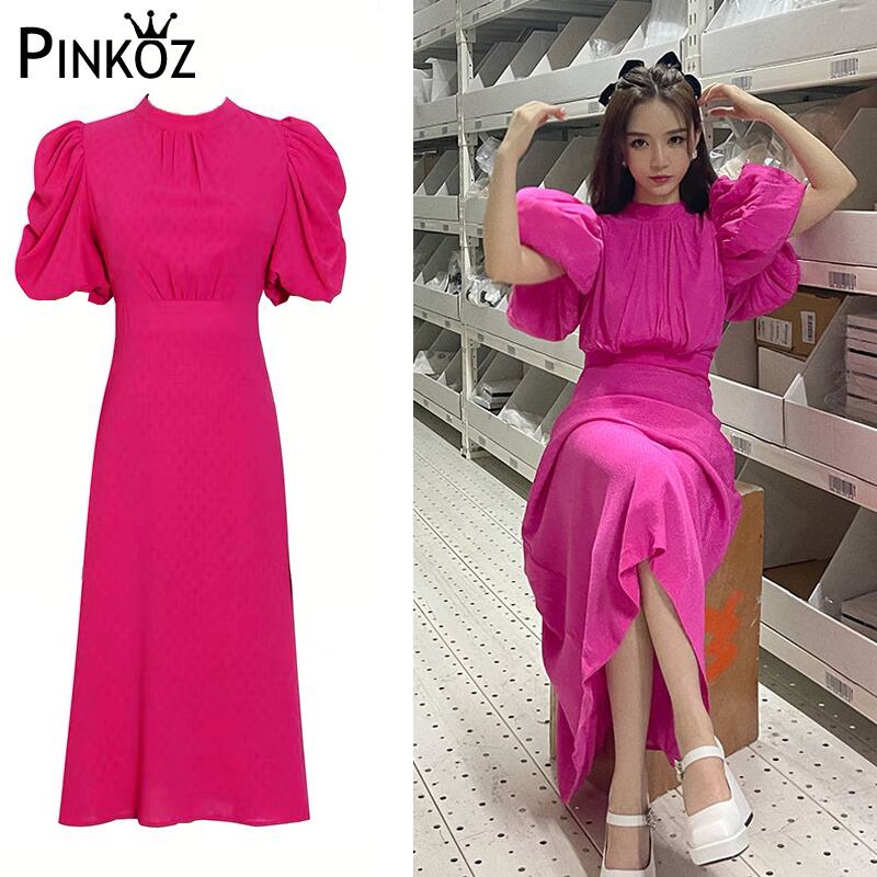 Pinkoz デザイナー woemn ミディ ドレス パフ スリーブ背中の開いたセクシーなペンシル ドレス パーティー ディナー赤スタンド カラー ヴィンテージ ファム ロパ z ピンク レッド フェミニン ビンテージ