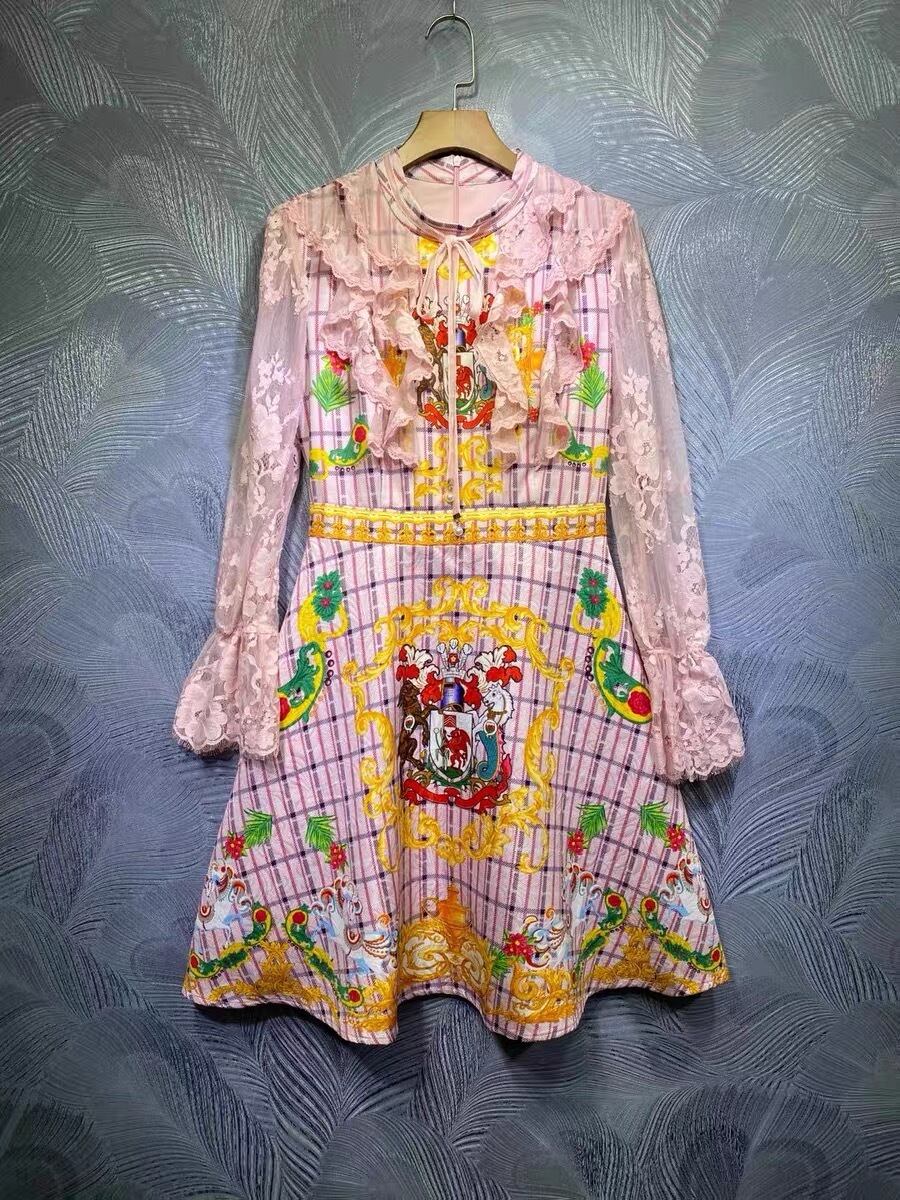 Pinkoz 春夏レース長袖ピンク ミニ A ライン ドレス女性かわいい プリント レース弓格子縞の ドレス vestidos mulher 新しい ロング リボン 大人ガーリー スウィート キュート カジュアル スプリング 春物 サマー 夏物 Aライン
