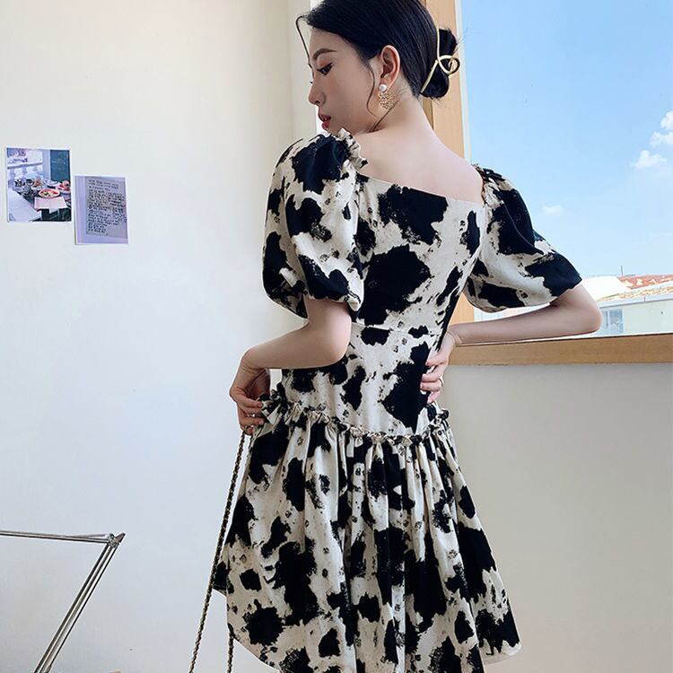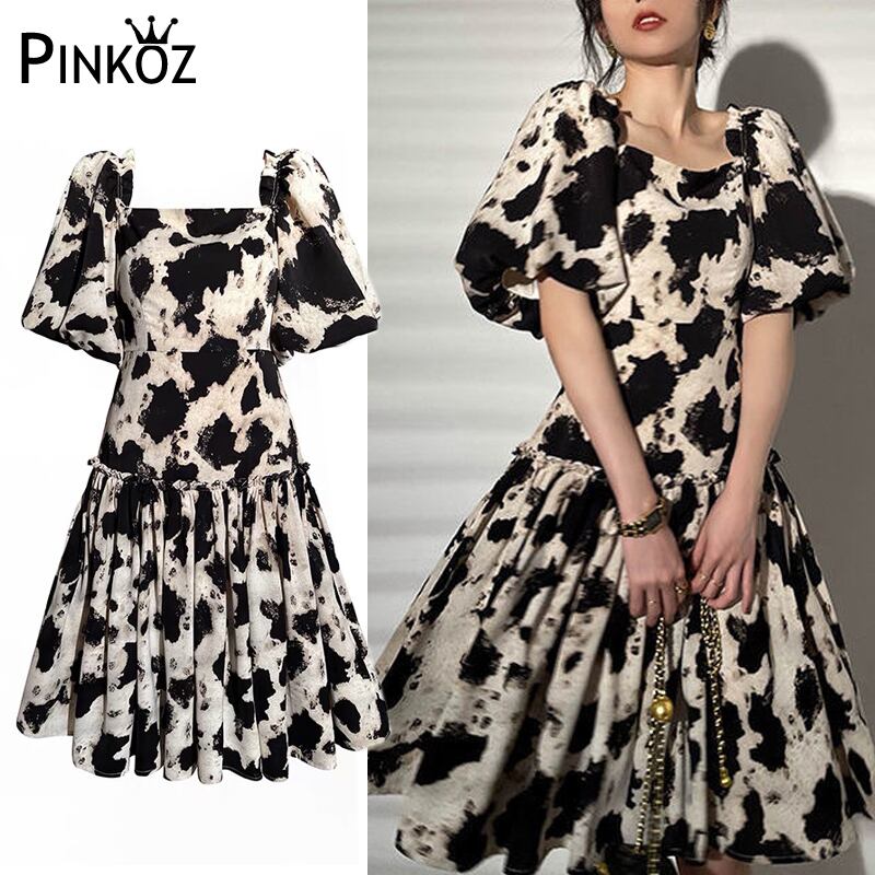 Pinkoz 女性の夏のパフ スリーブ スクエア カラー夏ベージュ黒花柄プリント カジュアル ドレス A ライン vestidos デ mujer ヴィンテージ ピンク ブラック サマー 夏物 Aライン スクウェア ビンテージ