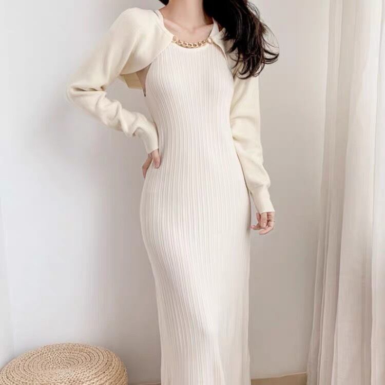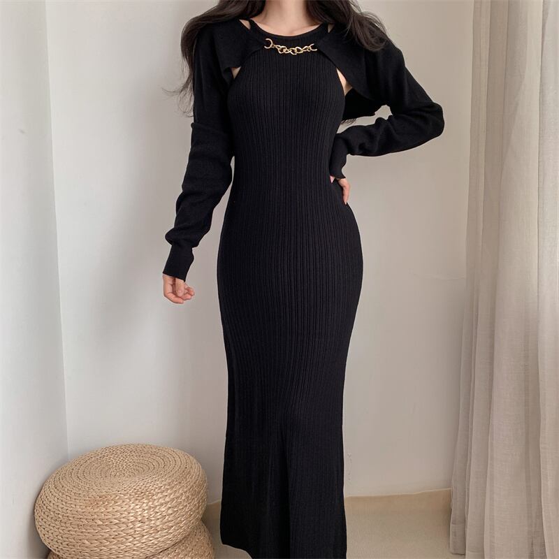 Pinkoz 女性デザイナー編み物スライミー黒 2 点セット ミディ ドレス秋冬金属チェーン エレガントなボディコン ロング ドレス traf ピンク ブラック ウィンター 冬物