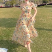 Pinkoz 女性の夏のセクシーなパフスリーブフローラルレースアップ背中の開いたドレス Vestdio ピンク サマー 夏物 花柄