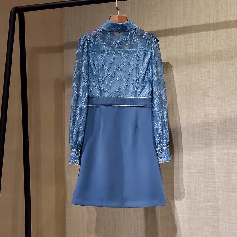 Pinkoz デザイナー スタイリッシュなブルー春ミニ ペンシル ドレス スタンド カラー パッチワーク レース フリル ボタン スパンコール ハイ ウエスト vestidos z ハイウェスト ピンク ラッフル スプリング 春物