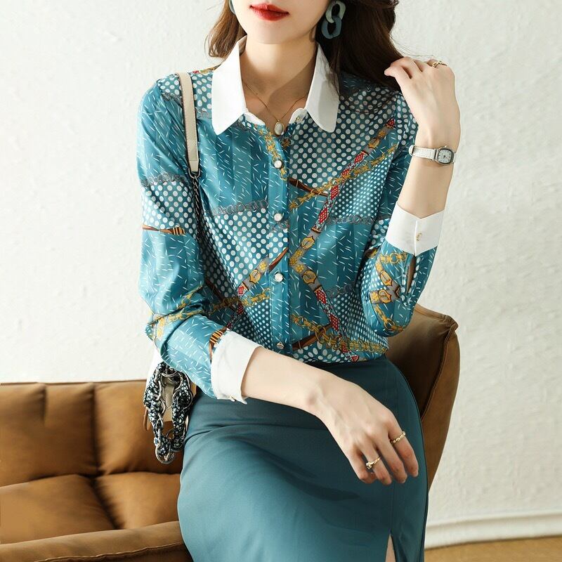 Pinkoz エレガントなブループリント女性シャツブラウスターンダウンチェーン花柄オフィスレディ作業服 roupas femininas ファッショントップス za ピンク フェミニン 会社 学校 通勤や通学にも
