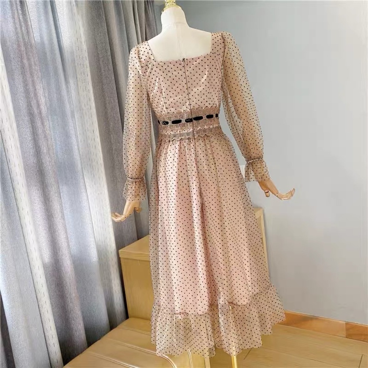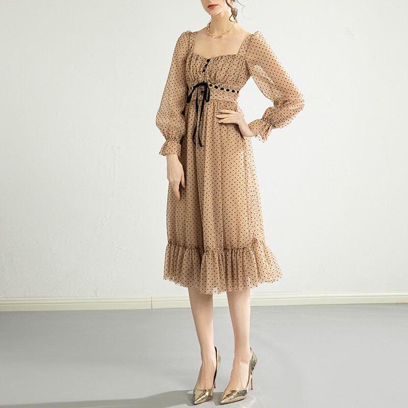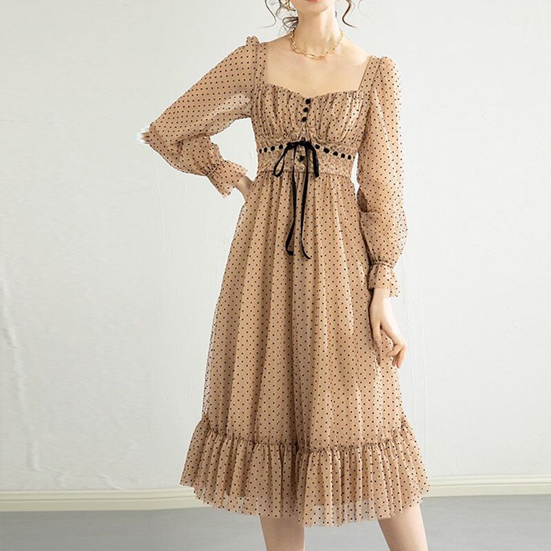 Pinkoz エレガントなソフトミディドレス女性ポルカドットハイウエストスクエアカラーレースアップフリル A ラインメッシュドレスパーティーシック ハイウェスト ピンク ラッフル Aライン スクウェア