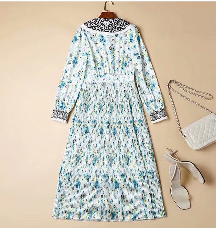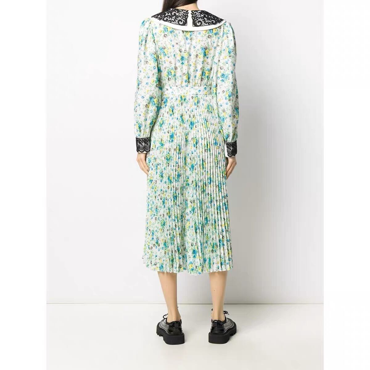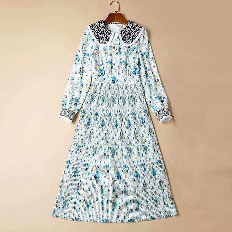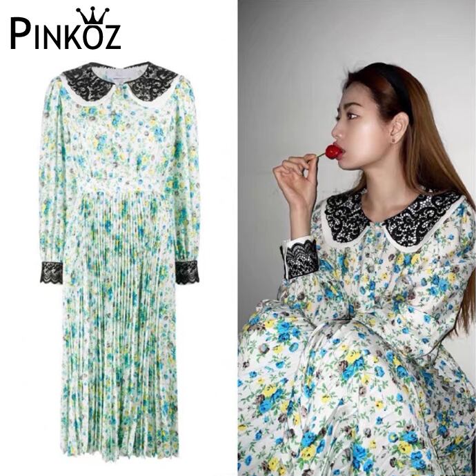 Pinkoz デザイナーフローラルプリントピーターパンカラーフルスリーブプリーツミディドレス女性パーティーカジュアルエレガントなドレス vestidos z ピンク 花柄
