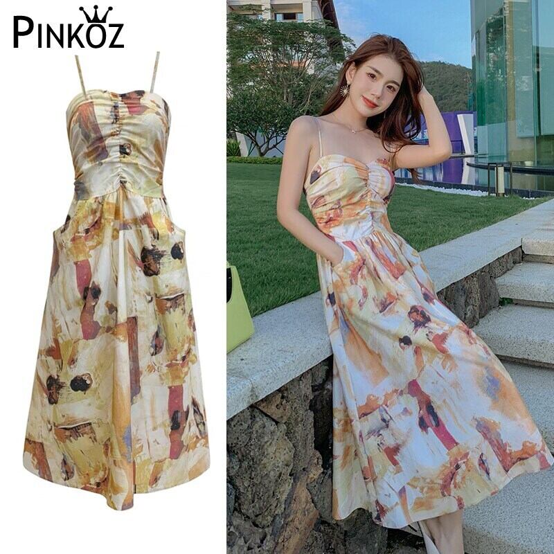 Pinkoz 女性の夏のミディ ドレス スパゲッティ ストラップ黄色塗装フローラル プリント ポケット休日自由奔放に生きるドレス シックな vestidos traf ピンク サマー 夏物 花柄
