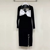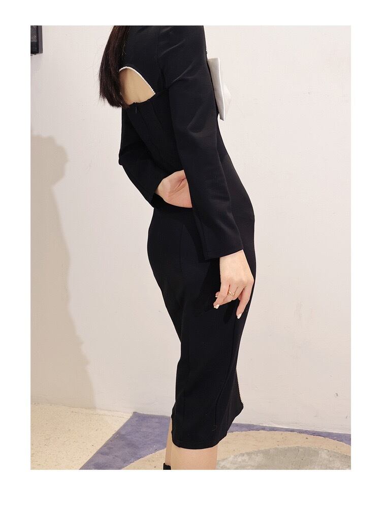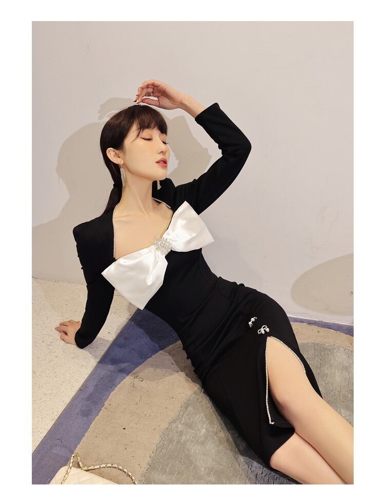 Pinkoz デザイナー ミディ ドレス黒ぬるぬるボディコン黒スクエア カラー フル スリーブ backle セクシーなビーズ クリスタル大きな弓パーティー ローブ ピンク ブラック リボン スクウェア