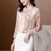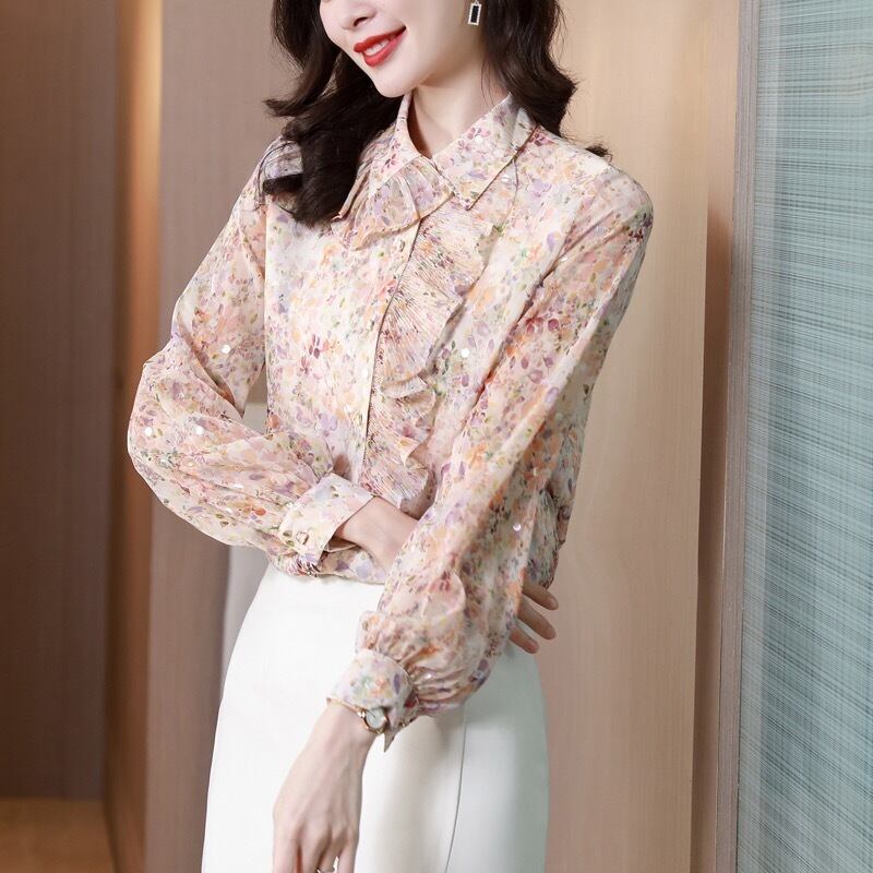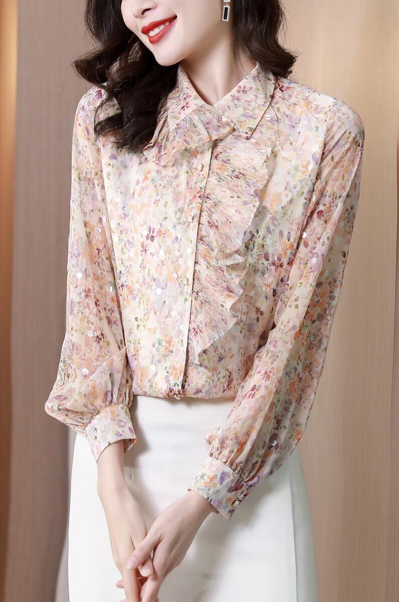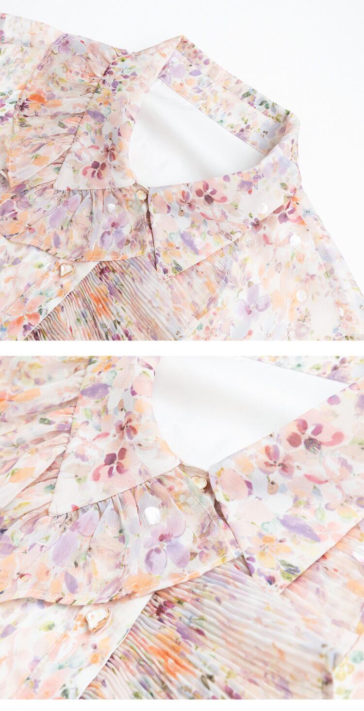 Pinkoz 女性ブラウス シャーリング花柄プリント フリル フラワー ターン ダウン襟シフォン ピンク シャツ sping 夏エレガント トップス ヴィンテージ ラッフル サマー 夏物 フラワーデザイン ビンテージ