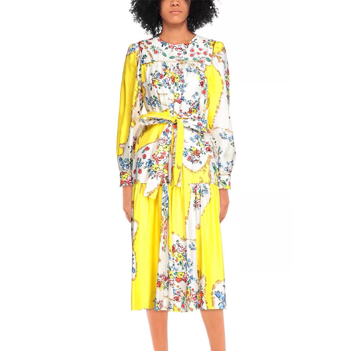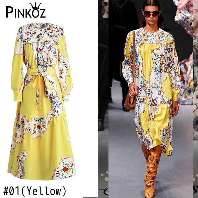 Pinkoz ヴィンテージ滑走路デザイナー O ネック春マキシ ドレス サッシ イエロー花柄プリント休日自由奔放に生きるドレス ファム ベストドス ファッション ピンク スプリング 春物 Oネック フェミニン ビンテージ
