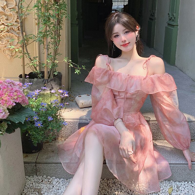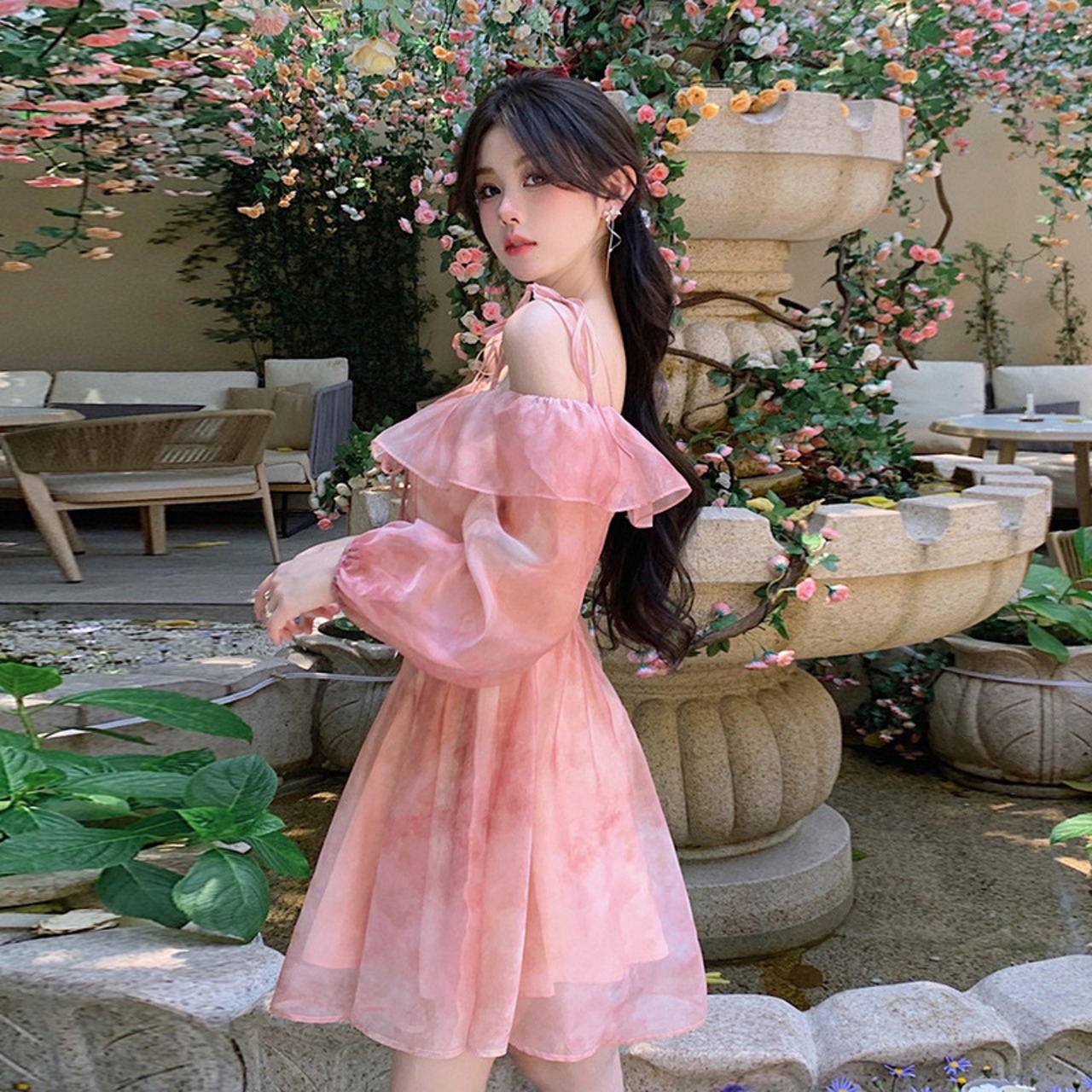 Pinkoz 女性の滑走路デザイナー サマー ドレス花柄スラッシュ ネック フリル A ライン ミニ ドレス長袖シフォン甘いローブ ロング ピンク ラッフル 大人ガーリー スウィート キュート カジュアル 夏物 Aライン