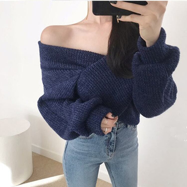 Pinkoz 韓国ファッション スラッシュ ネック デザイナー ベージュ セーター ランタン スリーブ セクシー クラブ ナイト ニット プルオーバー ルーズ カジュアル トップス トラフ ピンク ランタンスリーブ