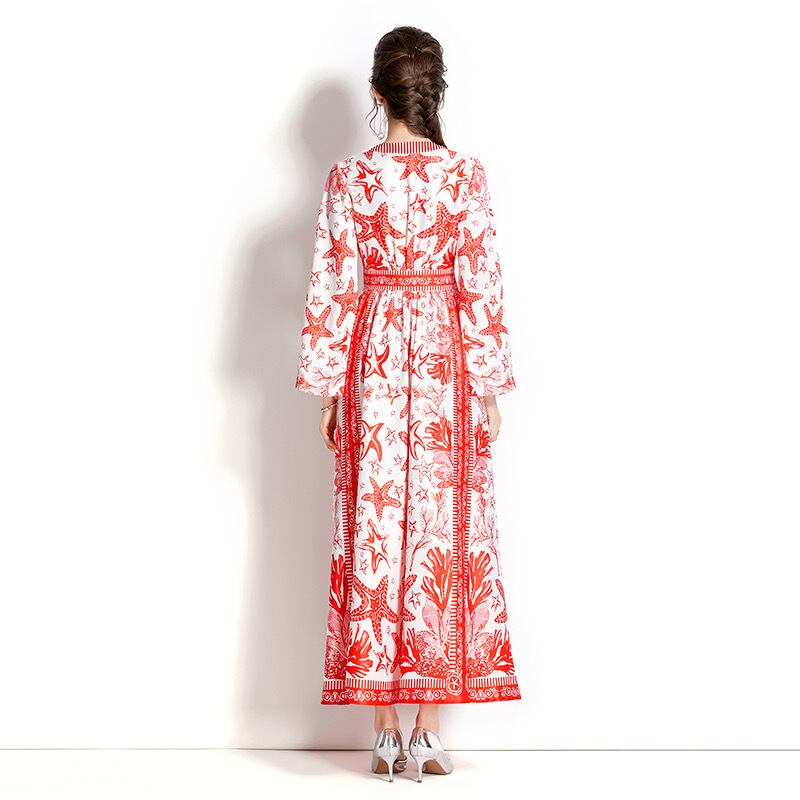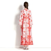 Pinkoz 夏マキシドレス女性 V ネック長袖花柄プリントボヘミアンマキシドレスシックなルーズサイズ Vestidos ロング ピンク サマー 夏物 Vネック