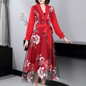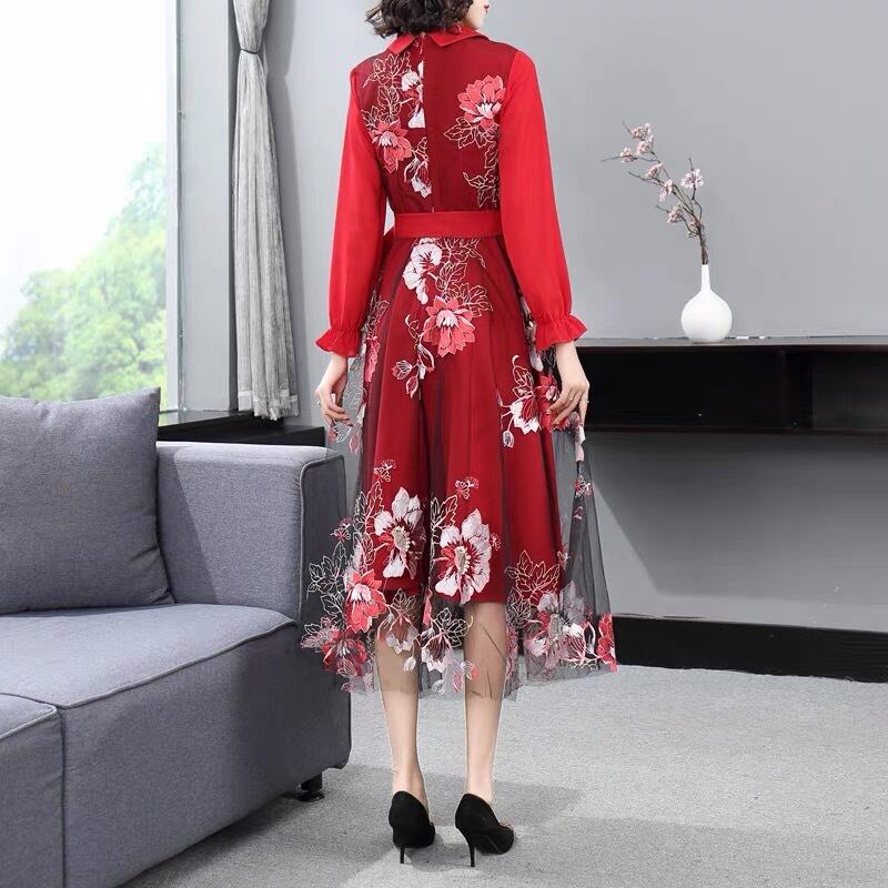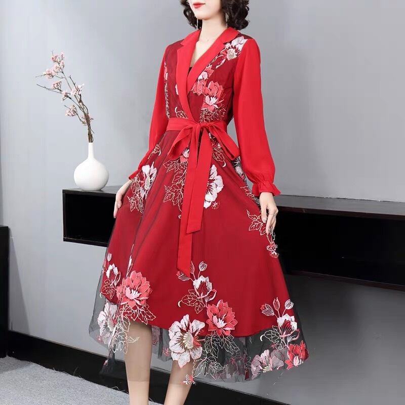 Pinkoz 女性赤ミディ ドレス刺繍パッチワーク メッシュ ノッチ付き襟ファム フェスティバル ローブ デ mujer ファッション服 ピンク レッド フェミニン